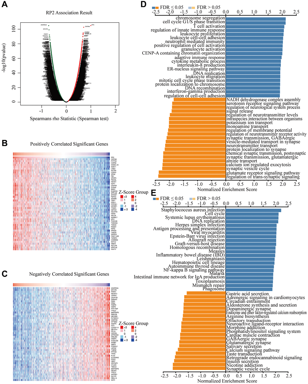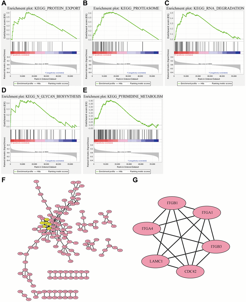 Since RP2 presents a clear value in terms of patient prognosis, we produced a landscape of RP2-related genes to further investigate its functional regulatory pathways. The results came out that among the 20119 correlated genes identified, 7081 genes were positively associated (red dots) and 6743 genes were negatively associated (dark green dots) with RP2 expression (FDR <0.01) (Figure 5A). Therefore, we individually took out the top 50 positively and negatively linked genes to make a correlation heat map (Figure 5B, 5C). Gene ontology (GO) showed that RP2 may be involved in processes related to T cell activation, cell cycle, G1/S phase transition, and interferon production (Figure 5D). Kyoto Encyclopedia of Genes and Genomes (KEGG) pathway analysis displayed that RP2 was positively associated with processes such as antigen processing presentation and cell cycle (Figure 5E). Additionally, GSEA displayed that RP2 was closely related to protein export, proteasome, and RNA degradation, and so on (Figure 6A–6E). These findings suggested that RP2 may be engaged in processes related to cell cycle and organismal immunity. To further understand the mechanism of RP2 regulatory function, we selected genes with RP2 correlation located in the top 500 to produce clusters of RP2-related protein interactions. The clusters of proteins most associated with RP2 are shown by Figure 6F (yellow). We selected them to visualize them individually (Figure 6G), and the results showed that RP2 had protein interactions with ITGA4 and CDC42, among others, and verified that these proteins show correlation with immune response and metastatic spread of tumor cells, confirming our speculation about the function of RP2. We speculated that RP2 is associated with the cell cycle and immune infiltration.