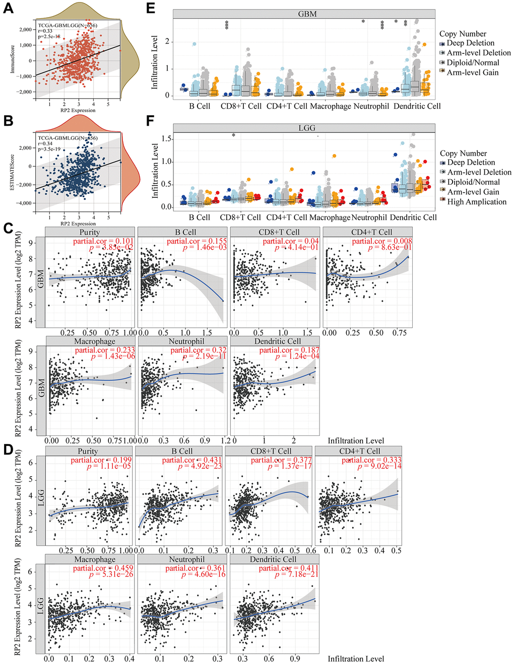 The TIMER (https://cistrome.shinyapps.io/timer/) is a collection of tools for systematically analyzing immune infiltrations in various cancer types [10]. The “Gene” and “scna” modules were used to predict the correlation among the infiltration of immune cells in each tumor sample and RP2 mRNA expression and copy number variation data in GBMLGG. And analyse the relationship between immune cell gene markers and other important contents with the help of the “Correlation” module. We also investigated the relationship between RP2 in pan-cancer and different immune cell infiltration.