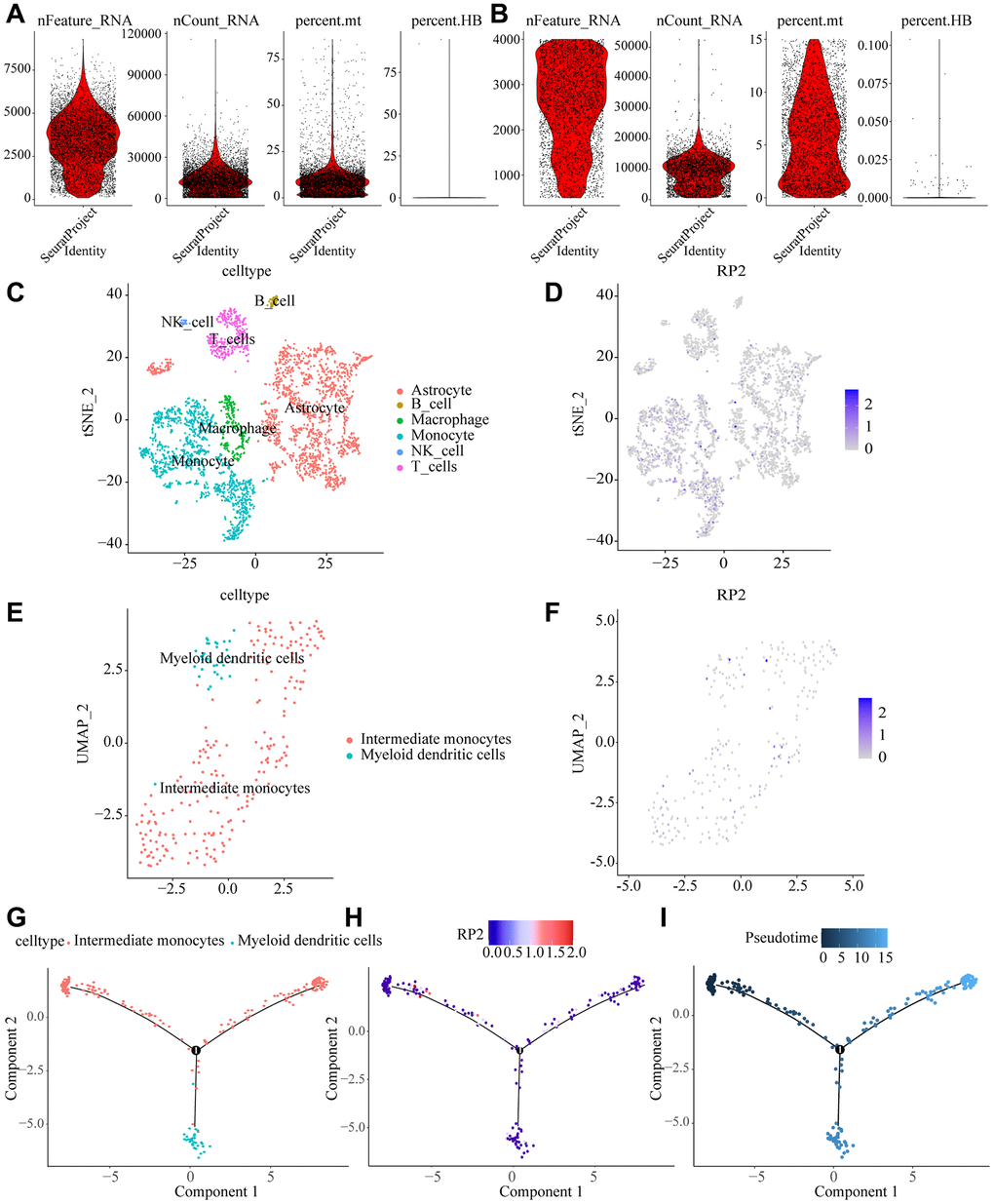 We analyzed macrophages by downscaling, unsupervised clustering and trajectory analysis, and found that they could be further identified as Intermediate monocytes and Myeloid dendritic cells (Figure 9G), and the expression of RP2 did not show significant differences among these two types of cells (Figure 9H). The dynamic cellular states in the tumor microenvironment were visualized by our Monocle algorithm, and pseudo-temporal trajectory analysis showed that Intermediate monocytes tend to be depleted in a trajectory with tumor progression, while RP2 would show low expression in the early stages of cell development and higher expression over time, while expression was gradually downregulated after the node (Figure 9I). The above results suggested that the degree of RP2 gene expression influences the progression of the glioma tumor microenvironment and it might play an important part in the evolution of tumor microenvironment in glioma patients.