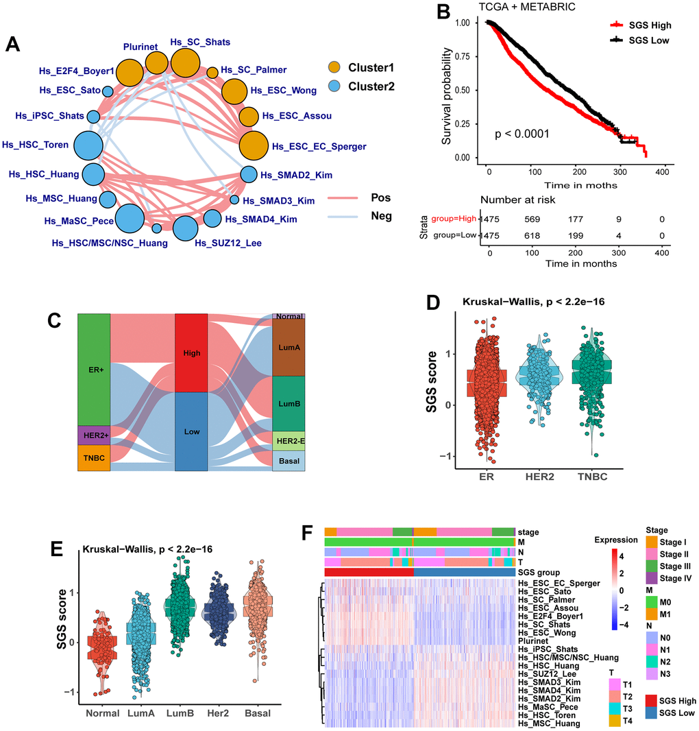 A flow diagram for the present analysis is shown in Extended Data Supplementary Figure 1. First, we used ssGSEA to calculate the normalized enrichment score (NES) of 36 stemness-related gene sets in the TCGA-BRCA and METABRIC integrated datasets. Then, the prognostic value of these NES values was evaluated by univariate Cox regression analysis. We identified 18 gene sets with the P-value <0.05 as prognostic factors (Supplementary Figure 2A, 2B) and drew a prognostic network of stemness genes (Figure 1A). We calculated he SGS for each patient by subtracting the risk factor score from the protective factor score and stratified all patients into high SGS group and low group by using the median SGS as the cutoff. Kaplan-Meier (KM) survival analysis showed that the high SGS group had a worse prognosis than the low SGS group (Figure 1B).