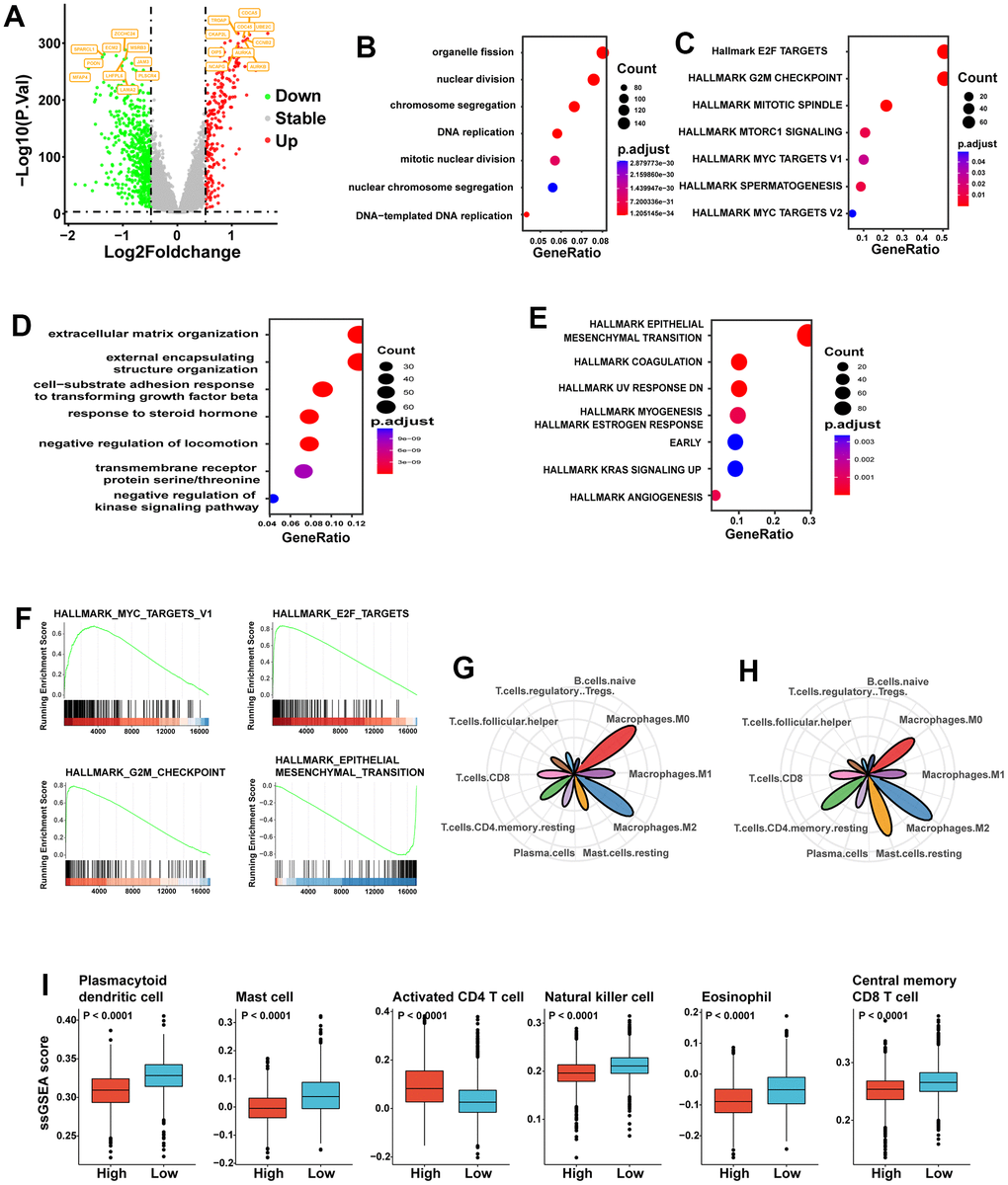 To identify mechanisms associated with a poor prognosis, we performed differential gene expression analysis between the two groups. Differentially expressed genes were split into up-regulated and down-regulated genes. Numerous genes associated with the cell cycle, including UBE2C and CCNE2, were up-regulated in the high SGS group (Figure 2A). Then, we performed analysis of up-regulated genes and down-regulated genes separately. We performed functional enrichment analysis on the differentially up-regulated genes using Gene Ontologies (GO) analysis and found that organelle fission, nuclear division and chromosome segregation-related pathways were highly enriched in the high SGS group (Figure 2B). Hallmark gene set enrichment analysis revealed that a series of signaling pathways related to cell proliferation, such as the E2F target, G2M checkpoint and mitotic spindle, were significantly up-regulated in the high SGS group (Figure 2C). GO analysis (Figure 2D) showed that down-regulated genes were mainly enriched in extracellular matrix organization and external encapsulating structure organization-related pathway. Hallmark gene set enrichment analysis showed that down-regulated genes were mainly enriched in epithelial-mesenchymal transition-related pathway. Gene set enrichment analysis (GSEA) analysis indicated similar pathway enrichment (Figure 2F).