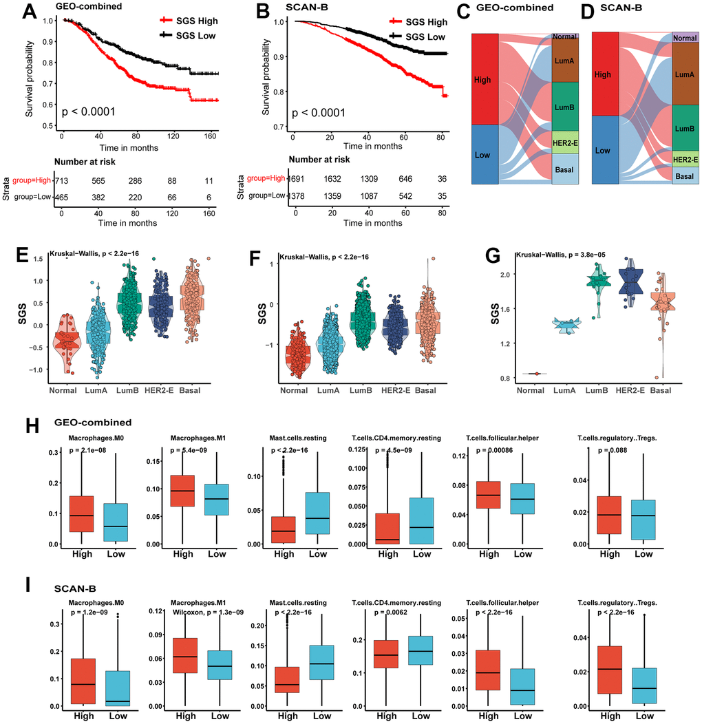To further verify the accuracy of SGS in predicting the prognosis of breast cancer patients, we employed two independent datasets included the SCAN-B dataset and integrated datasets for multiple breast cancer obtained from the GEO database (GEO-combined dataset) as validation datasets. We found that SCAN-B and GEO-combined dataset, breast cancer patients with high SGS also had a poor prognosis (Figure 3A, 3B), and the LumB, HER2-E and basal-like subtypes were the dominant molecular subtypes (Figure 3C, 3D). Similarly, patients with these subtypes also had high SGS (Figure 3E, 3F). We also calculated SGS for breast cancer cell lines from the Cancer Cell Line Encyclopedia (CCLE) database. LumB, HER2-E and basal-like type breast cancer cell lines had a higher SGS (Figure 3G). Immune infiltration analysis also showed that the content of macrophage, Tfh and Tregs in the high SGS group in the validation set was comparable to that in the test set (Figure 3H, 3I).
