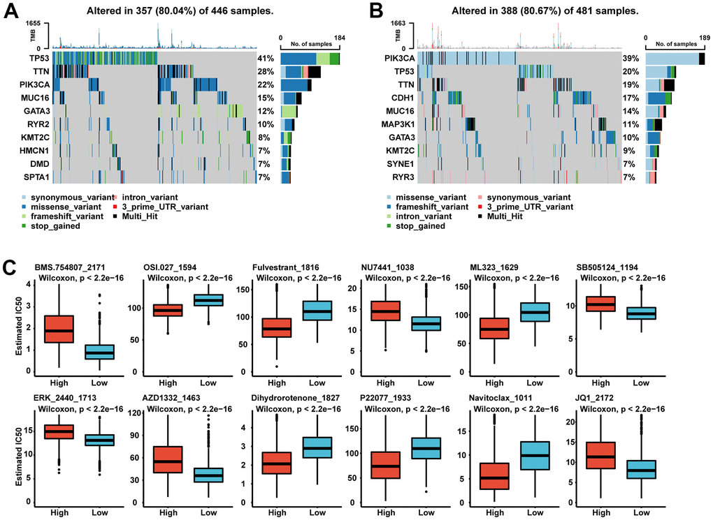 Therefore, we wanted to investigate whether there were differences in gene mutations between patients in the SGS high and low group. Although the two groups had approximately 80% of mutations observed in all genes, the two groups differed in the pattern of gene mutations. P53 and PI3KCA are the most frequently mutated genes in breast cancer. The high SGS group had a higher P53 mutations rate, while the low SGS group had a higher PI3KCA mutation rate. TTN gene mutations were also more common in patients in the high SGS group than in those in the low SGS group. For RYR family genes, the high SGS group was more likely to have RYR2 gene mutations, while the low SGS group was more likely to have RYR3 gene mutations (Figure 4A, 4B).