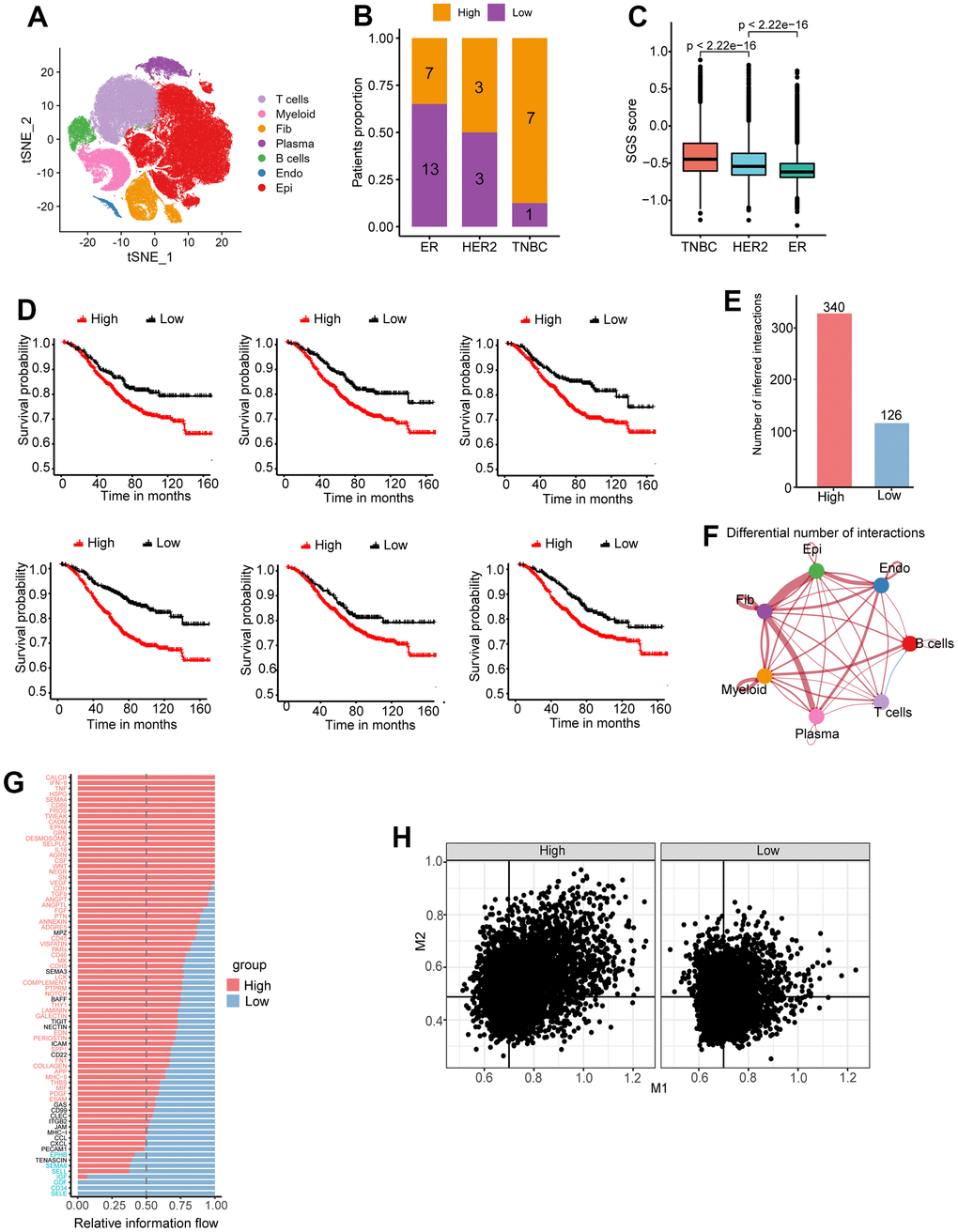 Typically, the phenotypes of macrophages are classified into M1 and M2 types; M1 macrophages display tumoricidal activity, while M2 macrophages promote tumor progression [37]. In the tumor microenvironment of breast cancer patients, M2-type macrophages predominate [38, 39]. With the rise of single-cell sequencing technologies, Zhang Zeming et al. proposed that macrophage cannot be simply classified into M1 and M2 types [40]. Single-cell sequencing confirmed that co-expression of M1 and M2 markers in individual cells. Recent work by Fanjia et al. supports this view [41]. Therefore, there is still much unknown about the relationship between macrophage polarization and cancer prognosis. Our study also found that the proportion of M1 and M2 marker-co-expressed macrophage in the TME was much higher in the high SGS group than in the low SGS group. This implies that the co-expression of M1 and M2 macrophage markers may be pro-cancer phenotype in breast cancer. This study differs from previous studies and may provide new insight into the development of breast cancer immunotherapy in the future.