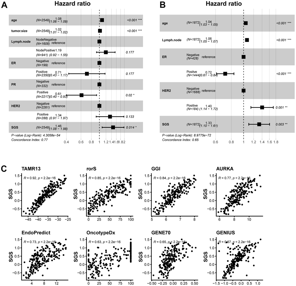 One-way cox regression analyses were performed in several datasets to determine whether SGS could be used as an independent prognostic factor in the clinic. The results suggested that SGS could be used as a risk factor and was associated with prognosis. Next, multivariate Cox regression analysis of SGS with clinical information were performed in SCAN-B dataset and METABRIC dataset. The results were consistent with the univariate analysis results (Figure 6A, 6B). These results indicate that the SGS can be used as an independent prognostic factor in clinical studies. Some clinical methods for calculating breast cancer prognosis that are widely used and clinically validated, such as GENE70 and genomic grade index (GGI), were compared with the SGS (Figure 6C). The SGS was found to have a strong correlation with these algorithms. Our results demonstrate that SGS have important clinical application value.