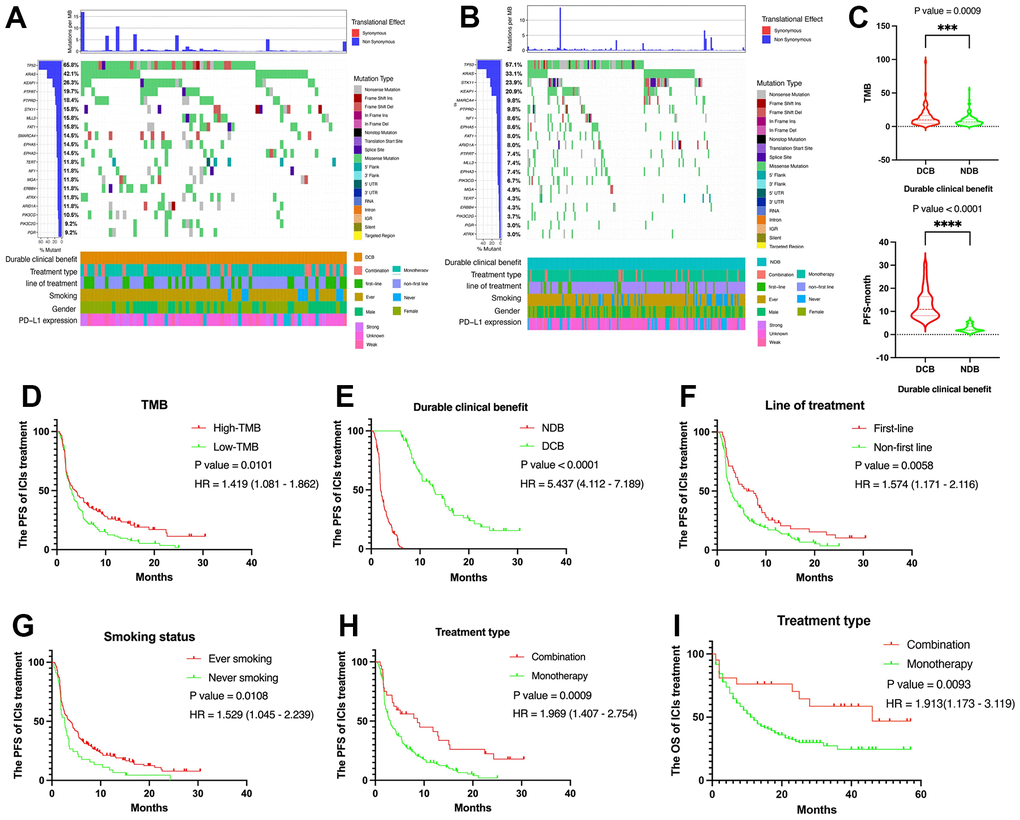 The top 20 gene alterations in DCB group include TP53, KRAS, KEAP1, PTPRT, PTPRD, STK11, MLL3, FAT1, SMARCA4, EPHA5, EPHA3, TERT, NF1, MGA, ERBB4, ATRX, ARID1A, PIK3CG, PIK3C2G, PGR (Figure 1A). We also examined those gene alterations in NDB group (Figure 1B). TMB (P = 0.0009) and PFS (P < 0.0001) were higher in DCB than NDB (Figure 1C). In addition, there are some clinicopathological variables were closely related to the PFS of ICIs including TMB (P = 0.0101, HR = 1.419 (1.081 – 1.862)), PD-L1 expression (P = 0.0062, HR = 1.799 (1.139 – 2.842)), line of treatment (P = 0.0058, HR = 1.574 (1.171 – 2.116)), smoking status (P = 0.0102, HR = 1.529 (1.045 –2.239)), and treatment type (P = 0.0009, HR = 1.969 (1.407 – 2.754)) (Figure 1D–1H). Moreover, treatment type (P value = 0.0093, HR = 1.913 (1.173 – 3.119)) was significantly related to the OS in advanced NSCLC patients with ICIs treatment (Figure 1I). And patient characteristics with NDB and DCB groups were shown in Table 1.