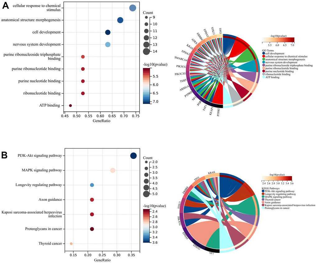 The results of GO analysis suggested that the significant enrichment of the top 20 genes was mainly associated with cellular response to chemical stimulus, anatomical structure morphogenesis, cell development, and nervous system development (Figure 2A). In addition, three pathways were particularly enriched including PI3K-Akt signaling pathway, MAPK signaling pathway, and Longevity regulating pathway (Figure 2B). These pathways are all associated with tumor development and progression.