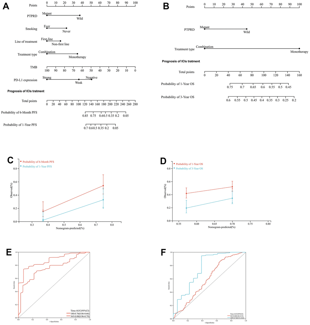 Survival analyses were performed using the Kaplan-Meier plot method and selected clinical variables to develop a novel nomogram. TMB (P value = 0.00101), PD-L1 expression (P value = 0.0062), line of treatment (P value = 0.0058), smoking status (P value = 0.00108), treatment type (P value = 0.0009) and PTPRD (P value = 0.0441) were significantly related to the PFS in advanced NSCLC patients with ICIs treatment (Figures 1D–1H, 3B). Based on these variables, we established a systematic nomogram to predict 6-month, and 1-year PFS for advanced NSCLC with ICIs (Figure 4A). The C-index of this nomogram was 0.680 (95% CI 0.617 to 0.742). The same, treatment type (P value = 0.0093) and PTPRD (P value = 0.0086) were significantly related to the OS in advanced NSCLC patients with ICIs treatment (Figures 1I, 3B). The survival probabilities for NSCLC patients with ICIs treatment at 1-year, and 3-year OS were predicted using a nomogram that was constructed based on these variables (Figure 4B). The C-index of this nomogram was 0.658 (95% CI 0.555 to 0.762). The calibration plot demonstrated great predictive performance of our two nomograms (Figure 4C, 4D). In addition, the ROC curve also showed a good ability of our two nomograms to predict 6-month PFS (AUC = 0.76), 1-year PFS (AUC =0.88), 1-year OS (AUC = 0.60), and 3-year OS (AUC = 0.76) of advanced NSCLC patients with immunotherapy (Figure 4E, 4F). Based on our nomograms, clinical physicians could obtain the total point based on all variable points, and then evaluate PFS and OS of each advanced NSCLC with immunotherapy.