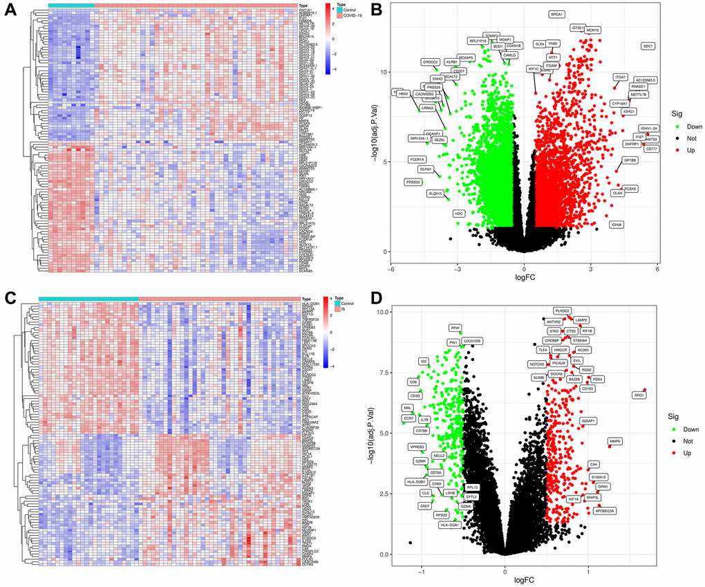 To explore the biological mechanism of COVID-19-related IS, we conduct a comprehensive analysis based on GEO database (GSE171110. GSE16561) as showed in Figure 1. GEO dataset (GSE171110) contains 54 samples, including 10 normal samples and 44 COVID-19 samples. As a result of preprocessing and removing batch effects from the COVID-19 samples, 7047 DEGs were identified, including 3190 upregulated genes and 3857 downregulated genes (Supplementary Table 2), and heatmap (Figure 2A) and volcano map (Figure 2B) showed remarkable differences. There are 63 samples in the GEO dataset (GSE16561), including 24 normal samples and 39 IS samples. The heatmap (Figure 2C) and volcano map (Figure 2D) showed remarkable differences after the IS samples were preprocessed and batch effects removed.