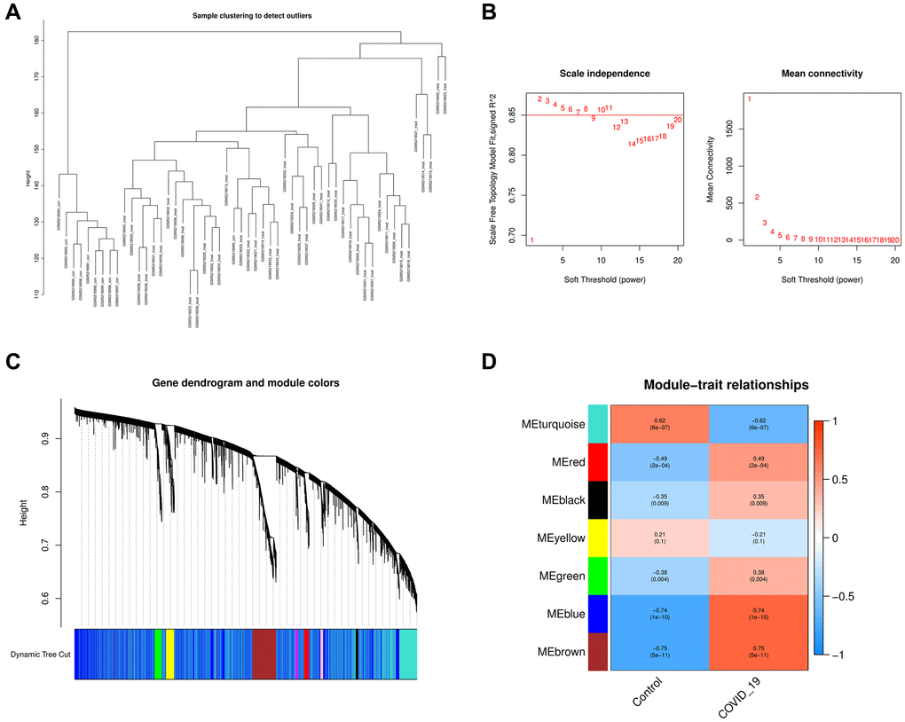 GSE171110 was analyzed using WGCNA, and we excluded outliers by selecting genes with SD >0. In addition to separating the data into different modules, we identified the modules most closely related to COVID-19 by setting the optimum soft threshold. Finally, to obtain more COVID-19-related genes after WGCNA analysis, we selected the blue and brown modules with the highest correlation for subsequent analysis.