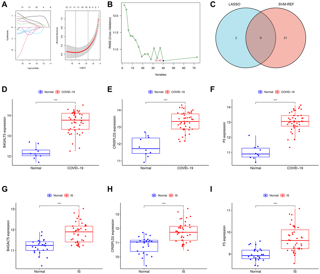 In order to function the disease status predictions, two machine learning algorithms were employed. Using the “glmnet” R package, a least absolute shrinkage and selection operator (LASSO)-based algorithm was used to identify marker genes. In order to identify the set of genes with the highest discriminative power, support vector machine-recursive feature elimination (SVM-RFE) was applied using the “e1071” R package. And 9 marker genes have been acquired through the intersection genes between the two algorithms. The expression stages of 9 marker genes were further examined in the validation cohort. To investigate COVID-19-related pro-disease factors in IS, we identified up-regulated genes. Finally, three genes were selected from nine genes that were highly expressed in both COVID-19 and IS.