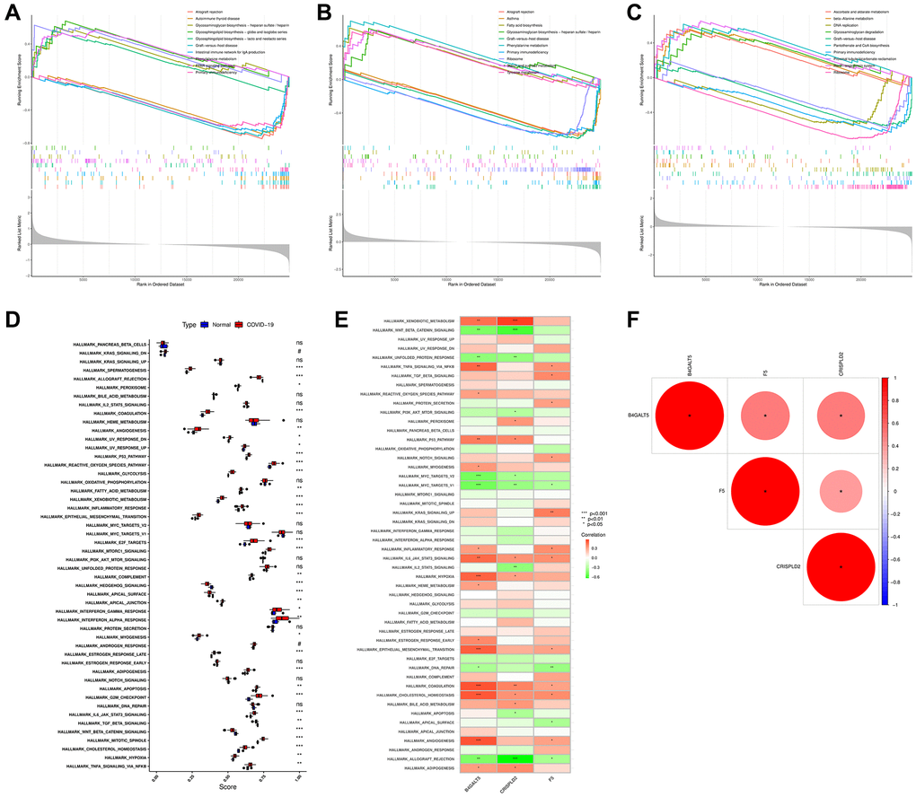 Using the identified genes, a logistic regression algorithm was used to construct the diagnosis model. In addition, we used AUC to quantify the capability of discrimination. As shown in Supplementary Figure 4, characteristic biomarkers showed high diagnostic efficacy in distinguishing COVID-19-related IS from control samples, with an AUC of 0.984 (95% CI 0.950–1,000) for B4GALT5, 0.966 (95% CI 0.914–0.998) for CRISPLD2, and 0.991 (95% CI 0.966 to 1.000) for F5. This further strengthens the diagnostic capability of these three characteristic genes as potential biomarkers for the diagnosis of COVID-19-related IS. Single gene analysis of ssGSEA was performed, and the results showed glycosphingolipid biosynthesis, phenylalanine metabolism, and PPAR signaling pathway were enriched in B4GALT5 high expression samples, while allograft rejection, autoimmune thyroid disease, graft–versus–host disease, intestinal immune network and primary immunodeficiency were enriched in B4GALT5 low expression samples (Figure 6A). As for CRISPLD2, the high expression group contained fatty acid biosynthesis, glycosaminoglycan biosynthesis, phenylalanine metabolism, starch and sucrose metabolism and tyrosine metabolism pathway, while low expression group contained allograft rejection, graft–versus–host disease, primary immunodeficiency, asthma and ribosome pathway (Figure 6B). High F5 expression group was involved in ascorbate and aldarate metabolism, beta–Alanine metabolism, glycosaminoglycan degradation, pantothenate and CoA biosynthesis, renin–angiotensin system pathway, while low F5 expression group was involved in DNA replication, graft–versus–host disease, primary immunodeficiency, proximal tubule bicarbonate reclamation and ribosome pathway (Figure 6C). In addition, we analyzed the relationship of 50 signature functional pathways with COVID-19 and hub genes using ssGSEA. The results showed many biological functional processes were closely related to the occurrence of COVID-19 including spermatogenesis, allograft rejection, peroxisome, coagulation, angiogenesis, p53 pathway, reactive oxygen species pathway, glycolysis, fatty acid metabolism, xenobiotic metabolism, inflammatory response, epithelial mesenchymal transition, E2F targets, mtorc1 signaling, complement, hedgehog signaling, apical, interferon response, myogenesis, estrogen response late, adipogenesis, apoptosis, g2m checkpoint, il6 jak stat3 signaling, TGF beta signaling, WNT beta catenin signaling, mitotic spindle, cholesterol homeostasis, hypoxia and TNFA signaling via NFKB (p < 0.05, Figure 6D). Importantly, as shown in Figure 6E, B4GALT5 was found to have a positive correlation with xenobiotic metabolism, TNFA signaling via NFKB, reactive oxygen species pathway, p53 pathway, myogenesis, inflammatory response, IL6 JAK STAT3 signaling, hypoxia, heme metabolism, estrogen response early, epithelial mesenchymal transition, coagulation, cholesterol homeostasis, angiogenesis and adipogenesis (p < 0.05), and a negative correlation with WNT beta catenin signaling, unfolded protein response, MYC targets, DNA repair and allograft rejection (p < 0.05). CRISPLD2 was found to have a positive correlation with xenobiotic metabolism, peroxisome, p53 pathway, IL6 JAK STAT3 signaling, hypoxia, coagulation, cholesterol homeostasis, bile acid metabolism and adipogenesis (p < 0.05), while a negative correlation with WNT beta catenin signaling, unfolded protein response, PI3k AKT mTOR signaling, MYC targets, IL2 STAT5 signaling, apoptosis and allograft rejection (p < 0.05). F5 was found to have a positive correlation with TNFA signaling via NFKB, TGF beta signaling, protein secretion, notch signaling, KRAS signaling up, inflammatory response, IL6 JAK STAT3 signaling, epithelial mesenchymal transition, coagulation, cholesterol homeostasis and angiogenesis (p < 0.05), and a negative correlation with DNA repair, apical surface and allograft rejection (p < 0.05). Finally, gene correlation analysis indicated that the three genes were positively correlated with each other (p < 0.05, Figure 6F).