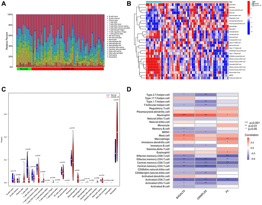 First, we summarized the results from 10 normal and 44 COVID-19 samples using the CIBERSORT algorithm (Figure 7A). In addition, we used ssGSEA algorithm to analyze immune cells subtypes between COVID-19 samples and normal samples (Figure 7B). As illustrated in Figure 7C, COVID-19 patients showed high infiltration of plasma cells, CD4+ T cells memory activated, M0 macrophages, dendritic cells activated and neutrophils than normal samples, while normal patients showed high level of B cells memory, CD8+ T cells and CD4+ T cells memory resting than COVID-19 patients. We also analyzed the relationship between the 3 hub genes and immune cells subtypes via a correlation heatmap, which indicated B4GALT5 had strong positive correlation with neutrophils, mast cells and Macrophages (p < 0.05), and had negative correlation with Th follicular cells, Th2 cells, memory B cells, MDSC, immature B cells, effector memory CD8+ T cells, effector memory CD4+ T cells, central memory CD8+ T cells, central memory CD4+ T cells, CD56- natural killer cells, activated CD8+ T cells, activated CD4+ T cells and activated B cells (p < 0.05). CRISPLD2 had strong positive correlation with neutrophil, and had negative correlation with Th1 cells, Th2 cells, Th follicular cells, MDSC, immature B cells, effector memory CD4+ T cells, central memory CD8+ T cells, central memory CD4+ T cells, CD56- natural killer cells, activated CD8+ T cells and activated CD4+ T cells (p < 0.05). F5 had strong positive correlation with neutrophils, macrophages, immature dendritic cells and eosinophils (p < 0.05), and had negative correlation with effector memory CD8+ T cells, effector memory CD4+ T cells, central memory CD8+ T cells, central memory CD4+ T cells and activated CD8+ T cells (p < 0.05, Figure 7D).