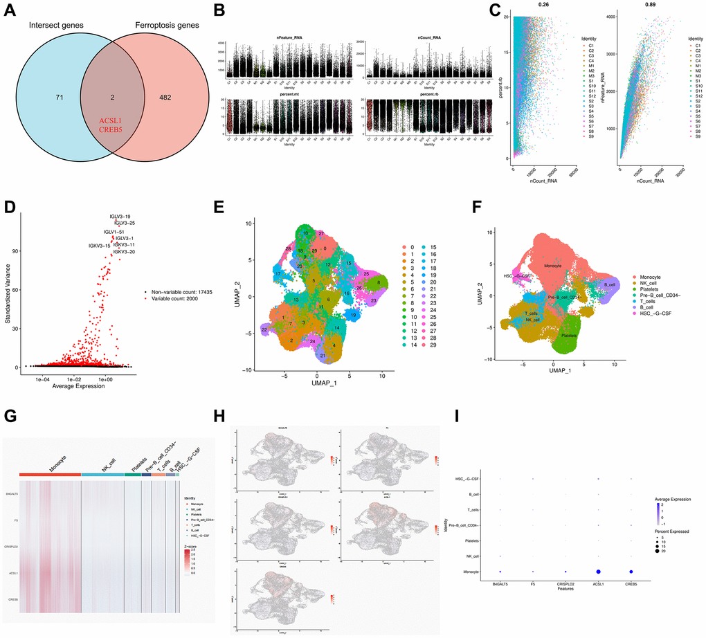 The single cell data set was subjected to quality control procedures. In Figure 8B, 8C, we removed some cells and controlled mitochondrial and ribosomal genes to ensure the quality of the samples. Then we identified 2000 highly variable genes and labeled the top 10. Hypervariable genes are highlighted in red in Figure 8D. Using UMAP, the cells are grouped into 30 clusters, which can be classified into monocytes, NK cells, platelets, pre-B cells, CD34+ T cells, B cells, and HSC–G–CSF (Figure 8E, 8F).
