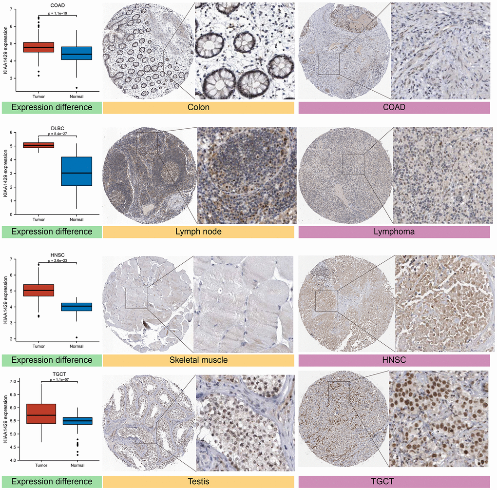 The expression levels of the target gene in various human tissues and organs were investigated using the HPA database, which integrates proteomics and transcriptomics data [19]. Based on the HPA database, we acquired IHC images of the KIAA1429 protein in four types of tumors and their corresponding normal tissues, including COAD, diffuse large B-cell lymphoma (DLBCL), head and neck squamous cell carcinoma (HNSC), and testicular germ cell tumors (TGCT).