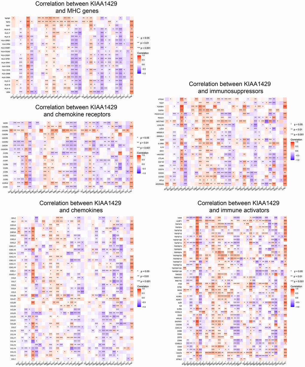 To investigate the association between KIAA1429 expression and immune-related genes, we conducted a co-expression analysis across cancers. Figure 4 illustrates the association of KIAA1429 with a majority of immune-related genes in cholangiocarcinoma (CHOL), HNSC, KIRC, PCPG, and UVM. However, in COAD, LUAD, LUSC, MESO, PRAD, READ, SARC, SKCM, STAD, THCA, and THYM, KIAA1429 exhibits a notable negative correlation with the majority of immune-related genes.