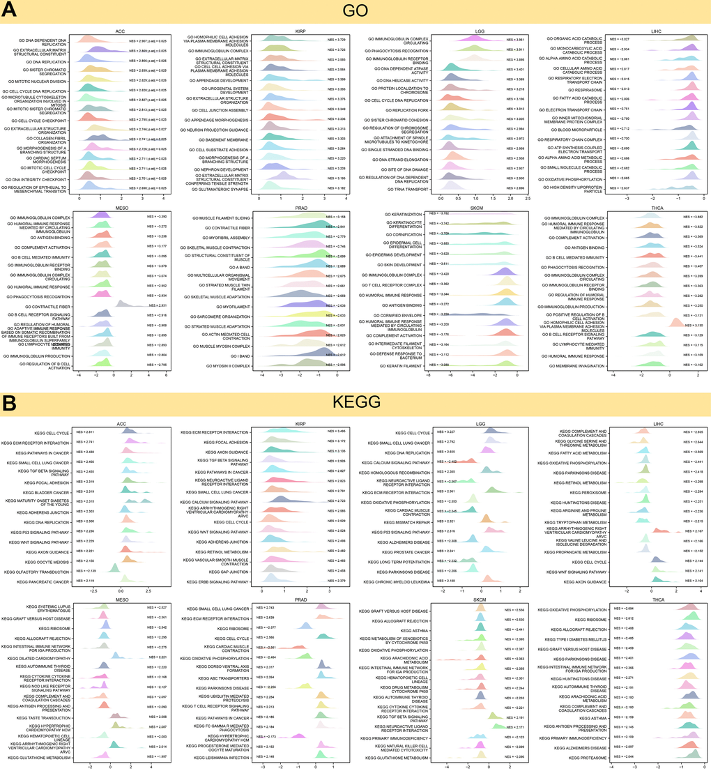 GSEA and GSVA were employed to investigate the biological significance of KIAA1429 expression across cancers. Figure 5A illustrates that KIAA1429 negatively regulates lymphocyte/B cell-mediated immunity, immune response, immune regulation, and B cell receptor signaling in MESO and THCA. However, KIAA1429 serves as a stimulator for cell cycle, DNA replication, and extracellular matrix remodeling in ACC, KIRP, and LGG.