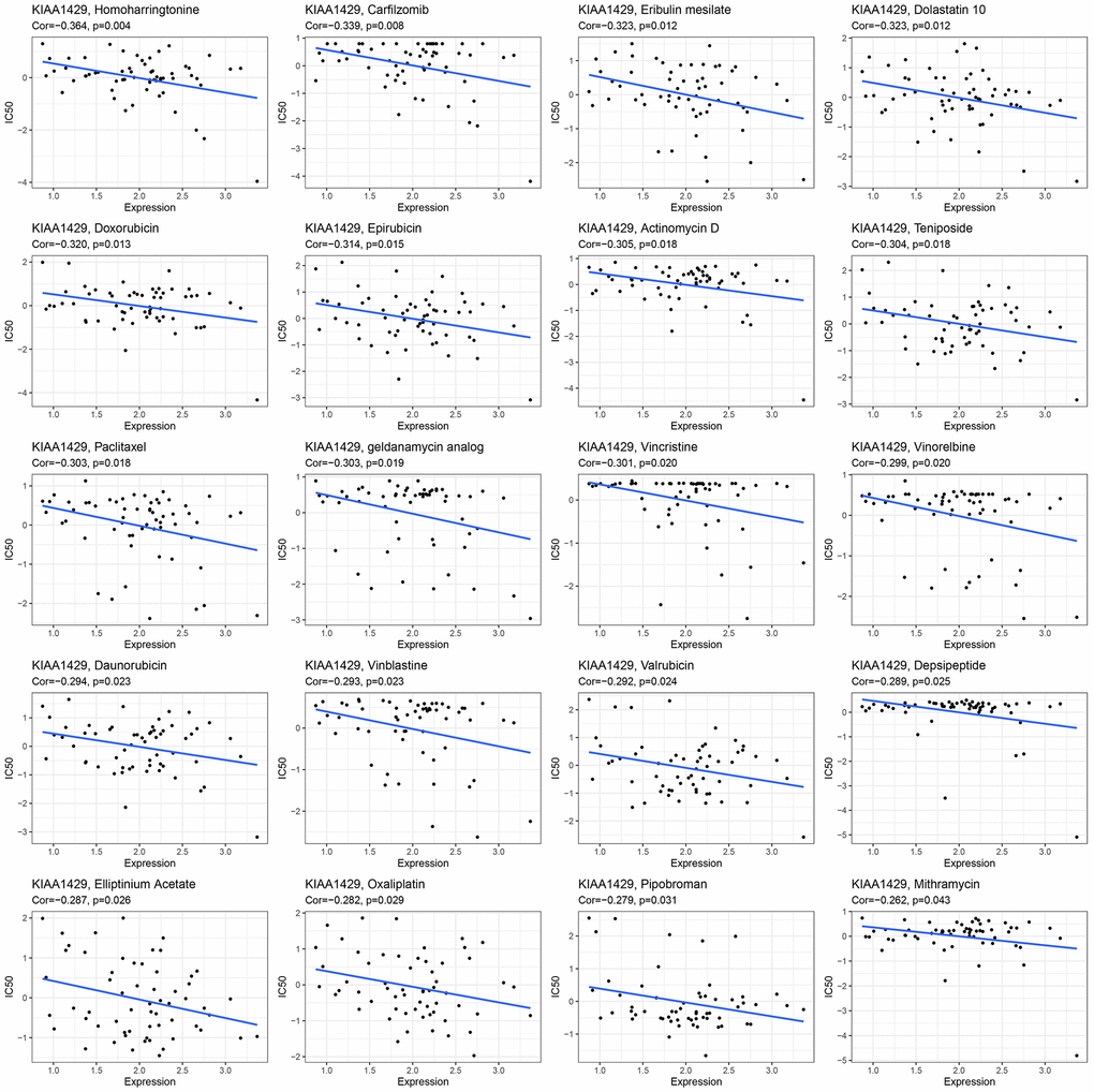 This study investigates the role of KIAA1429 expression in predicting the response to immunotherapy in tumor patients treated with ICIs. KM analysis indicates that elevated KIAA1429 expression is associated with shorter OS in patients with BLCA (p=1.4e-4) (Figure 6B). Figure 6C demonstrates that the group with high KIAA1429 expression has a response rate of 25.10%, whereas the group with low KIAA1429 expression exhibits a response rate of 10.64%. The significance of the difference between the high and low KIAA1429 expression groups is 0.0301. Consequently, BLCA patients with high KIAA1429 expression demonstrate increased sensitivity to immunotherapy. These findings indicate that KIAA1429 serves as a promising prognostic biomarker and predictor for immunotherapy in BLCA patients. Moreover, the analysis of drug sensitivity demonstrates a negative association between KIAA1429 expression and twenty anti-cancer drugs (Figure 7).