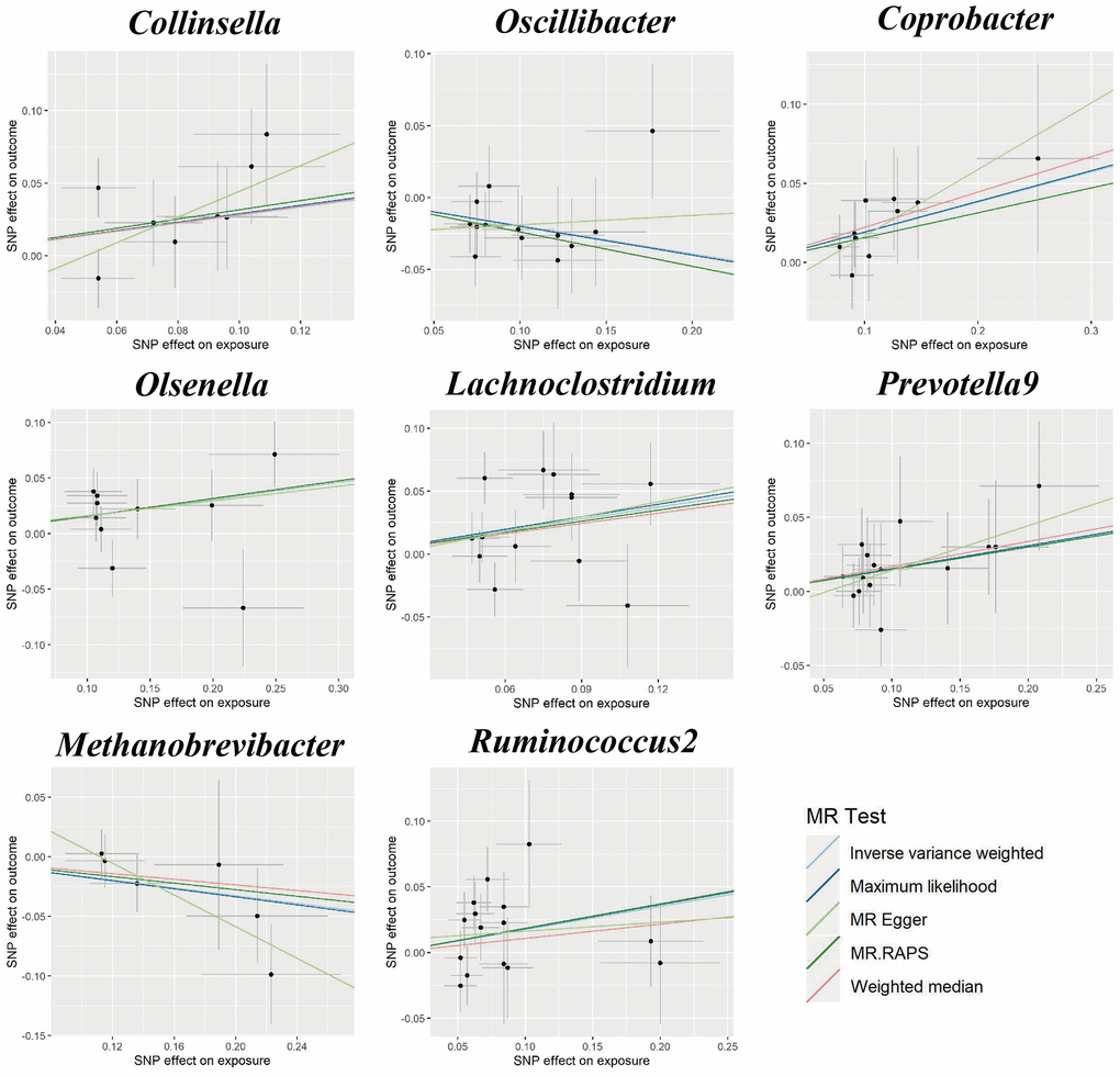 Figure 1 shows the results obtained using the IVW method at a significance threshold of P < 0.05. We identified significant positive associations between increases in Collinsella (OR, 1.322; 95%CI, 1.007-1.735; P < 0.001), Coprobacter (OR, 1.210; 95%CI, 1.037-1.412; P = 0.015), Olsenella (OR, 1.166; 95%CI, 1.030-1.321; P = 0.015), Lachnoclostridium (OR, 1.367; 95%CI, 1.057-1.767; P = 0.017), Prevotella9 (OR, 1.164; 95%CI, 1.010-1.342; P = 0.036), Ruminococcus2 (OR, 1.193; 95%CI, 1.003-1.418; P = 0.046) and a higher risk of GDM. Conversely, genetically increased levels of Oscillibacter (OR, 0.822; 95%CI, 0.706-0.957; P = 0.011) and Methanobrevibacter (OR, 0.850; 95%CI, 0.725-0.995; P = 0.043) were associated with a protective effect on GDM. Even after correcting for multiple comparisons, we observed a significant causal effect of increased Collinsella on the risk of GDM (q = 0.091). The F-statistics ranged from 20.39 to 336.56 in the aforementioned results, excluding the bias from weak instrumental variables. Additionally, we identified causal associations between GM and GDM risk in more than three MR methods, including IVW, MaxLik, WM, MR-Egger regression, and MR.RAPS (Table 1 and Figure 2).
