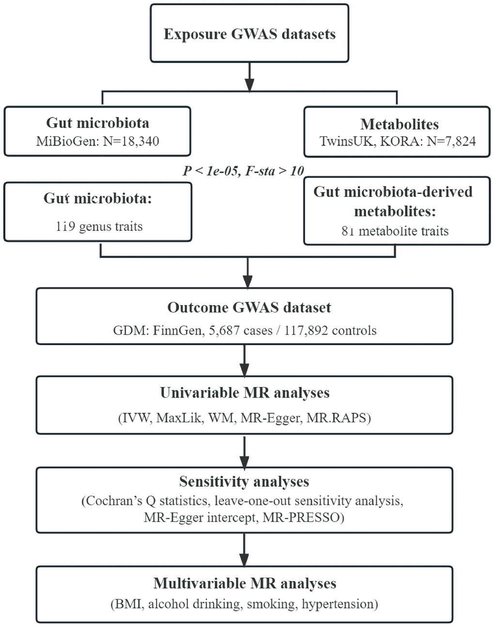 Reverse MR analysis was used to confirm the direction of causality. The methods were similar to forward MR, except for setting GDM as the exposure and GM or GM-derived metabolites as the outcomes. Finally, we conducted multivariable MR (MVMR) analysis, taking into account potential confounders that might influence the outcome. Specifically, four confounders including BMI, alcohol drinking, smoking, and hypertension were adjusted in MVMR, respectively.
