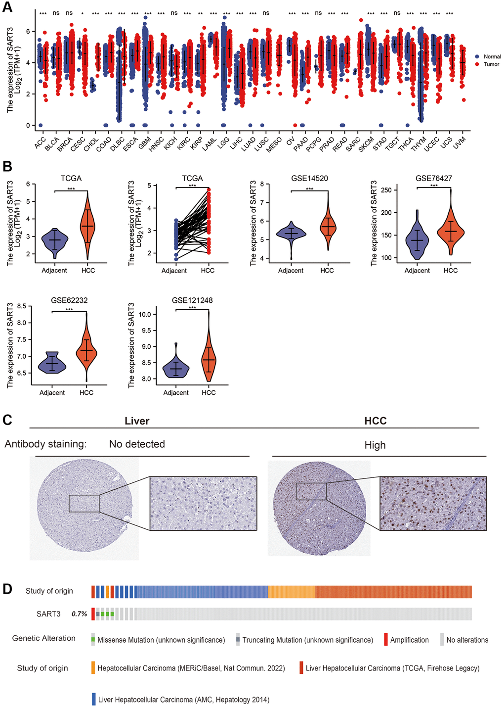 Transcriptomic data pertaining to 33 human cancers were procured from the Cancer Genome Atlas (TCGA) and GTEx, which are publicly available data platforms hosted on the UCSC XENA platform (https://xenabrowser.net/datapages/) [18]. Furthermore, clinical data, survival data, and somatic mutation data of LIHC were acquired from TCGA, and the maftools R package was utilized to visualize somatic mutation data [19]. The GSE14520, GSE76427, GSE121248, and GSE62232 datasets were retrieved from the publicly accessible Gene Expression Omnibus (GEO) platform (https://www.ncbi.nlm.nih.gov/geo/) [20]. Lastly, we obtained data on SART3 amplification, truncation mutation, and splice mutation from the cBioPortal for Cancer Genomics platform for three HCC datasets (MERiC, Nat Commun/TCGA, Firehose Legacy/AMC, Hepatology 2014) [21]. We also acquired data on HCC drug sensitivity from the GDSC (Genomics of Drug Sensitivity in Cancer) database.