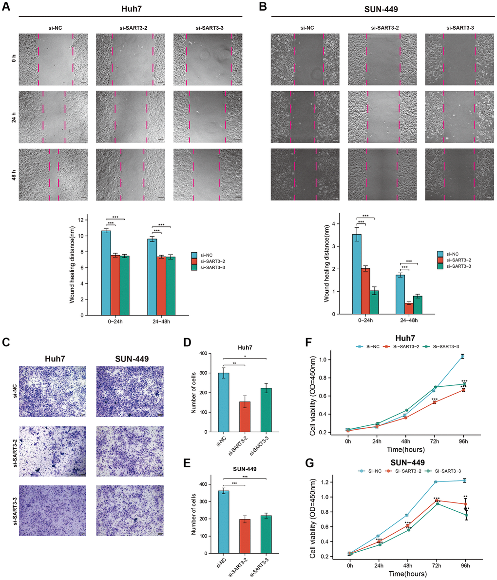 We quantified SART3 expression levels in various liver cancer cell lines through qPCR analysis and observed that Huh-7 and SUN-449 had the highest SART3 expression (Supplementary Figure 3A). Consequently, we selected Huh-7 and SUN-449 cells to study the effects of SART3 downregulation with siRNA technology, which was verified through qPCR analysis (Supplementary Figure 3B, 3C). Our results from the Wound-Healing and Trans-well assays indicated that inhibition of SART3 expression reduced the migratory ability of HCC cells (Figure 10A–10E). Moreover, the CCK8 assay revealed that SART3 downregulation impeded the proliferation ability of HCC cells (Figure 10F, 10G).