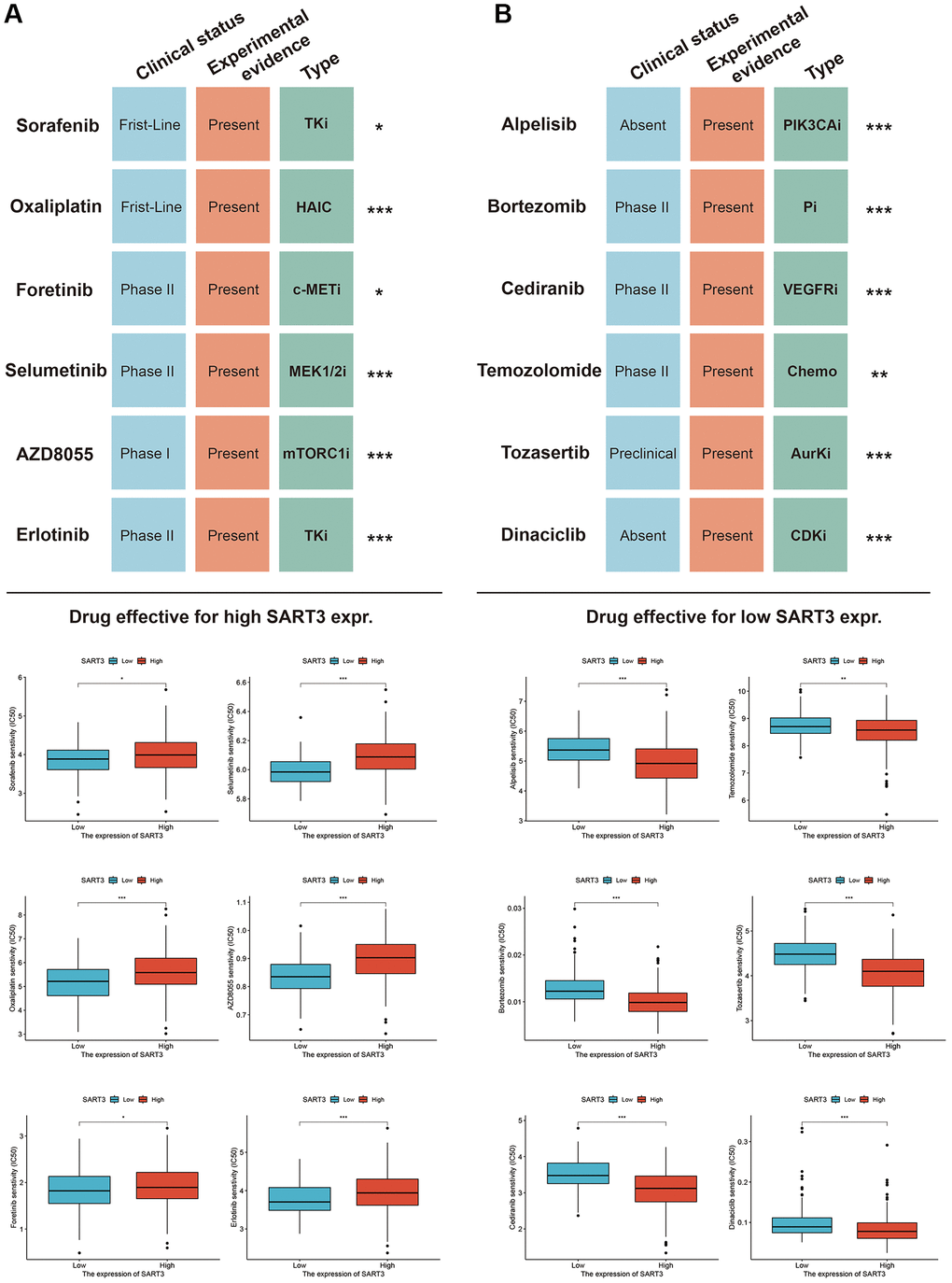 In this study, we aimed to explore the clinical therapeutic value of SART3 for HCC by identifying potentially sensitive therapeutic agents through the GDSC database. We used high and low SART3 expression as criteria for selecting the drugs. The results indicated that the following drugs were sensitive for the high SART3 expression group: Sorafenib, Oxaliplatin, Foretinib, Selumetinb, AZD8055, and Erlotinib (Figure 11A). For the low SART3 expression group the sensitive drugs were alpelisib, bortezomib, cediranib, temozolomide, tozasertib, and dinaciclib (Figure 11B). To gain further insight into the therapeutic value of these drugs in HCC, we searched PubMed (https://www.ncbi.nlm.nih.gov/pubmed/) and the Clinical Trials Registry (https://www.clinicaltrials.gov/) to compile a list of the drugs and investigate their therapeutic targets, experimental evidence, and clinical trial stages. Our findings are presented in Figure 11.
