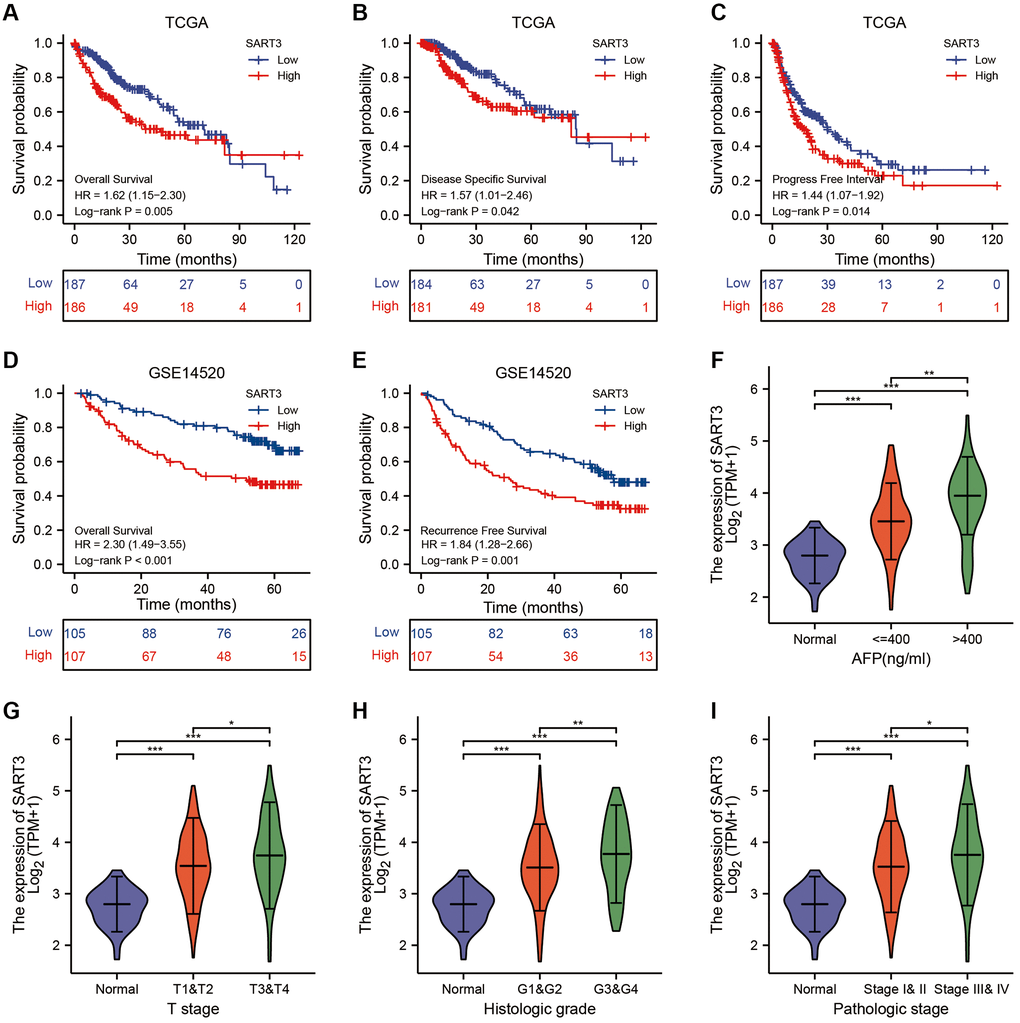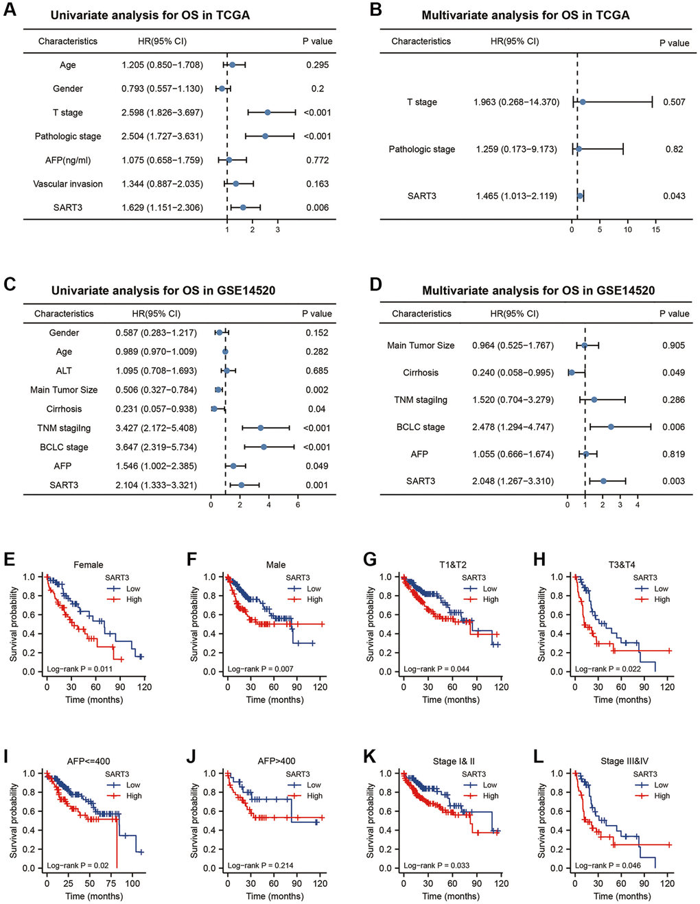 To evaluate the impact of SART3 on patient survival in hepatocellular carcinoma (HCC), we conducted a comprehensive analysis of various datasets. In the TCGA dataset, we observed that SART3 overexpression (grouped at median) was significantly associated with poorer overall survival (OS) (p = 0.005), disease-specific survival (DSS) (p = 0.042) and progression-free interval (PFI) (p = 0.014) (Figure 2A–2C). Similarly, in the GSE14520 dataset, SART3 overexpression (grouped at median) was significantly associated with poorer OS (p < 0.001) and relapse-free survival (RFS) (p = 0.001) (Figure 2D, 2E). Furthermore, we analyzed the expression levels of SART3 in different stages of HCC and found that its overexpression was associated with advanced stages of HCC (Figure 2G–2I) and higher levels of AFP (Figure 2F). Univariate analysis in TCGA showed that SART3, T-stage, and pathological stage demonstrated a significant correlation with an unfavorable prognosis (Figure 3A). Similarly, in GSE14520, SART3 (low vs. high, HR 2.104, p = 0.001), main tumor size (>5 cm vs. ≤5 cm, HR 0.506, p = 0.002), cirrhosis (Yes vs. No, HR 0.231, p = 0.04), AFP (≥300 ng/ml vs. >300, HR 1.546, P = 0.049), TNM stage (I and II vs. III, HR 3.427, p < 0.001) and BCLC stage (stage 0 and A vs. B and C, HR 3.647, p < 0.001) were also significantly associated with poor prognosis (Figure 3C). Multivariate analysis in TCGA and GSE14520 showed that the high expression of SART3 was a standalone risk factor for HCC (p < 0.05) (Figure 3B, 3D), particularly in subgroups of male and female patients, different T stages, pathological stages, and AFP levels (Figure 3E–3L). In summary, our findings suggest that SART3 overexpression is an independent poor prognostic factor for HCC.