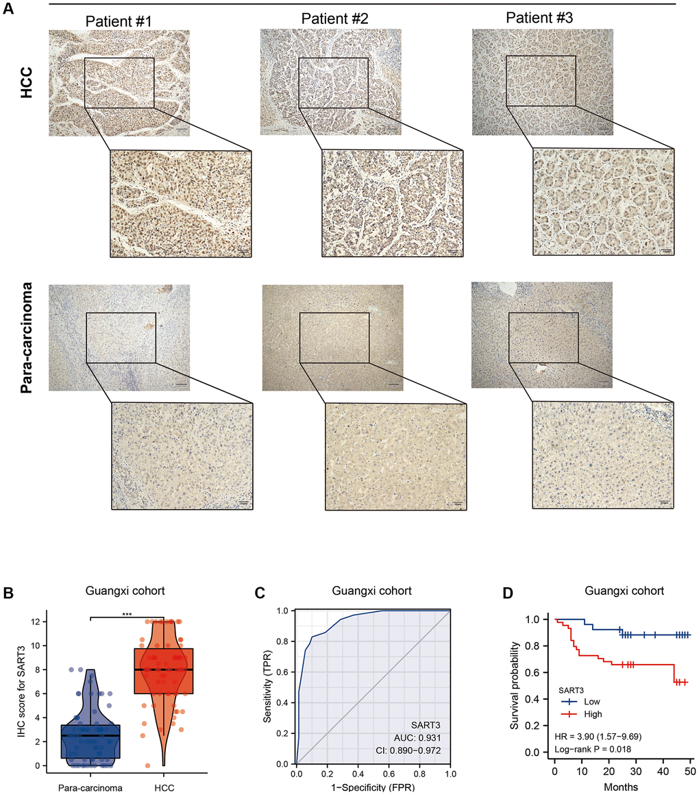 In order to further validate the findings presented above, we conducted an immunohistochemical analysis on paired HCC and paraneoplastic tissues obtained from the First Affiliated Hospital of Guangxi Medical University (n = 70; baseline information is provided in Table 1). Our results demonstrate a significant increase in the nuclear expression of SART3 in HCC tissues compared to adjacent tissues (Figure 4A). This observation was confirmed by higher immunohistochemistry (IHC) scores in HCC tissues compared to adjacent tissues (p < 0.001) (Figure 4B). Remarkably, our results indicate that SART3 exhibits excellent diagnostic performance in the Guangxi cohort (AUC = 0.931) (Figure 4C), and that its overexpression is associated with a poorer prognosis for HCC patients (p = 0.018) (Figure 4D).