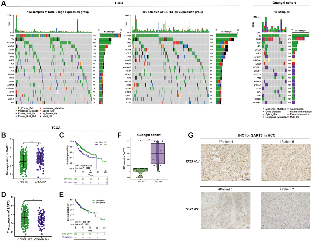 To investigate the somatic mutation landscape of SART3 in HCC patients, we obtained somatic mutation data from HCC patients using the GDC data platform. We then utilized the maftools R package to visualize the results in mutation annotation format (MAF). Our analysis revealed the top 20 genes with the highest mutation frequency, including TP53 (40%), TTN (23%), CTNNB1 (22%), MUC16 (16%), LRP1B (12%), OBSCN (10%), RYR2 (10%), and XIRP2 (10%) in the SART3high group, and CTNNB1 (30%), TTN (25%), TP53 (16%), ALB (16%), MUC16 (16%), PCLO (14%), APOB (13%) in the SART3low group (Figure 5A). Notably, the mutation frequency of TP53 was significantly higher in the SART3high group than in the SART3low group (40% vs. 16%), whereas the mutation frequency of CTNNB1 was lower in the SART3high expression group than in the SART3low group (22% vs. 30%). To further elucidate the relationship between SART3 and TP53/CTNNB1 mutation, we examined the expression level of SART3 in the TP53/CTNNB1 mutation group and wild group, and performed survival analyses. Our results showed that the expression level of SART3 was significantly higher in the TP53 mutation group than in the wild group (p < 0.001) (Figure 5B), while the expression level was lower in the CTNNB1 mutation group than in the wild group (p = 0.037) (Figure 5D). Additionally, survival analysis revealed that the TP53 mutation group had worse survival (p = 0.003) (Figure 5C), while the CTNNB1 mutation was not associated with patient survival time (p = 0.868) (Figure 5E). Furthermore, we verified our results by immunohistochemistry in the Guangxi cohort, which revealed that the expression of SART3 was significantly elevated (p = 0.009) in the TP53 mutation group (Figure 5F), as demonstrated in representative images in Figure 5G.