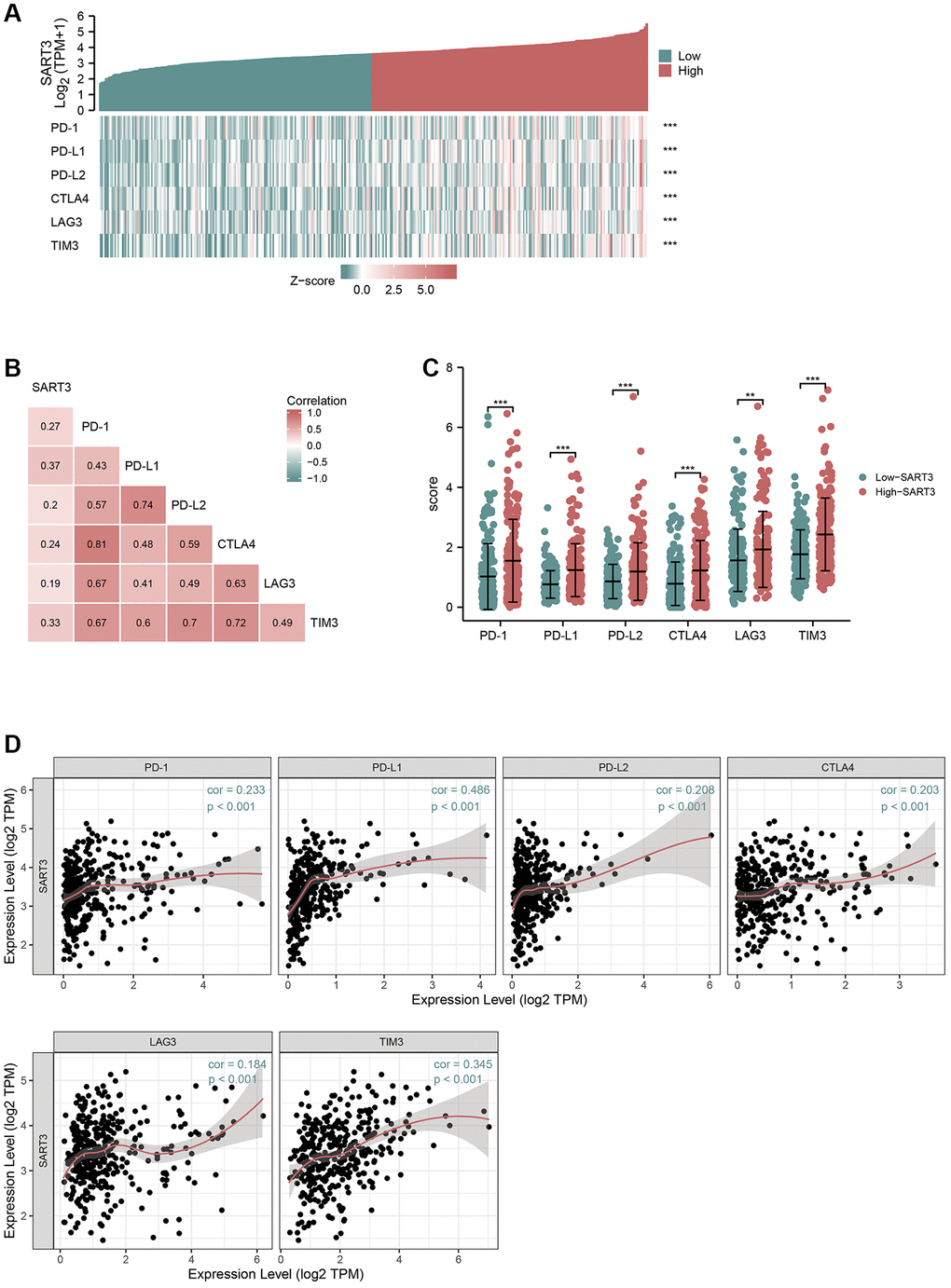 TP53 is the most frequently mutated gene in human cancers [33], and p53’s oncogenic role is critical in the regulation of cell cycle, cell death, and transcription factors. Mutation of TP53 impairs the function of p53, leading to cancer development by regulating other transcription factors [34]. In our study, we found that SART3 expression was significantly upregulated in TP53-mutated HCC and correlated with poor prognosis of patients. Our findings suggest that SART3 may be a downstream gene regulated by p53, and its regulatory function is impaired after TP53 mutation leading to upregulation of SART3. TP53 mutations are predictive of immunotherapy efficacy [35] and upregulate immune checkpoint expression. Immunosuppressive agent’s efficacy correlates with the expression of immune checkpoints [29]. We further investigated the correlation between SART3 and immune checkpoints, and our results indicate that high expression of SART3 significantly upregulates the expression of immune checkpoints.