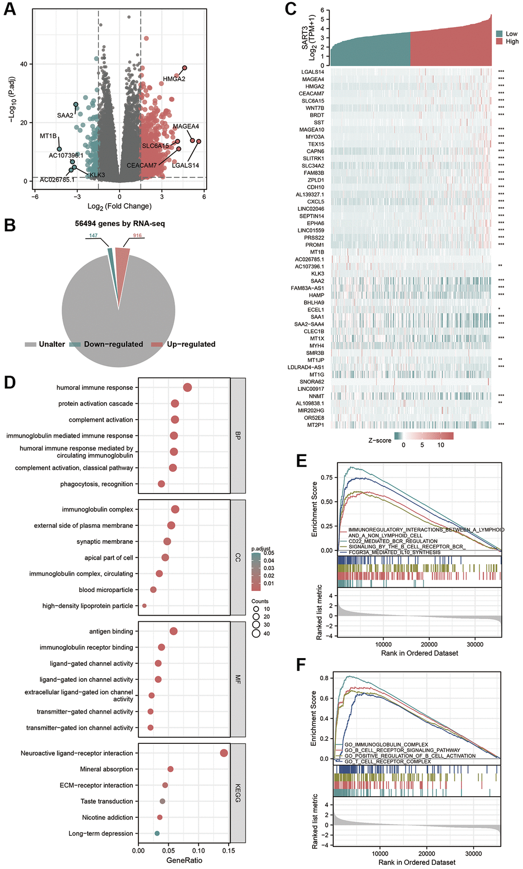 To investigate the potential mechanisms underlying the role of SART3 in HCC, we identified 1063 DEGs (|log2FoldChange| >1.5, p < 0.05) between samples with high and low SART3 expression in the TCGA LIHC cohort (Figure 7A). Of these, 916 genes were up-regulated and 147 genes were down-regulated (Figure 7B), and we demonstrated the top 25 up/down-regulated genes using a heat map (Figure 7C). Functional enrichment analysis of GO and KEGG of the DEGs revealed that SART3 is involved in immune infiltration-related pathways of HCC, such as the classical pathway of complement activation, humoral immune response mediated by circulating immunoglobulin, immunoglobulin receptor binding, antigen binding, and immunoglobulin-mediated immune response (Figure 7D). Additionally, the results of GSEA analysis indicated that SART3 was closely associated with immune infiltration, such as immunomodulatory interactions between lymphocytes and non-lymphoid cells, signaling of the B-cell receptor RCR, immunoglobulin complex, B-cell receptor signaling pathway, and T-cell receptor complex (Figure 7E, 7F). The results of the DEGs enrichment analysis and GSEA suggest that SART3 may influence HCC invasion and metastasis through immune cell infiltration and response in tumors.