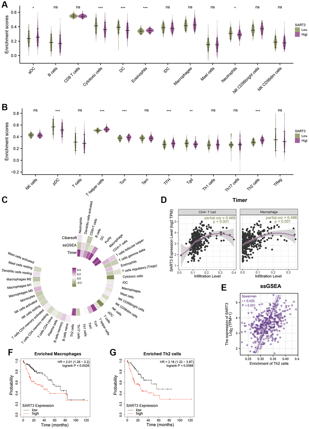 Tumorigenesis, invasion, and metastasis are tightly linked to the tumor microenvironment (TME), which comprises stromal cells, such as fibroblasts, and infiltrating immune cells, such as macrophages [36, 37]. The immune response to tumor cells can have a dual effect, activating both anti-tumor pathways and creating an immunosuppressive microenvironment [38]. Research has demonstrated that macrophage infiltration in tumor tissue leads to poor patient prognosis and is associated with resistance to chemotherapeutic agents in most cancers [39]. The main function of Th2 cells is to suppress T cell activation, allowing the body to accept foreign cells. The TH1/TH2 balance is crucial, and when Th2 cells over suppress Th1 cells, the body becomes susceptible to tumor development [40]. Additionally, some studies have revealed that oncogenes can regulate immune infiltration in tumor cells [41]. In our study, by conducting enrichment analysis of GSEA and identifying DEGs, we found that SART3 was significantly enriched in the immune infiltrative pathway. Moreover, we discovered that it is closely associated with several immune cells, such as Th2 cells and macrophages, and may affect patient prognosis through them.