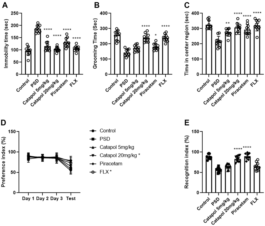 We firstly investigated the behavioral effects of the catapol to PSD mouse. Catapol were treated to the mouse after MCAO with the dosage of 5mg/kg/d and 20mg/kg/d. Another two groups of mice were treated with frequent used brain recovery medications piracetam and SSRIs antidepressant fluoxetine (FLX) as 2 groups of positive control. Forced swim test (FST) was conducted for testing the learned helplessness behavior. Compared with PSD model, treatment of catapol with low (5mg/kg) and high (20mg/kg) dosages both reduced the immobility time in FST (Figure 1A, one-way ANOVA, p<0.001 vs. PSD group). Piracetam and FLX treatments gained the comparable effects as catapol (Figure 1A, one-way ANOVA, p<0.001 vs. PSD group). In splash test result, high dosage of catapol could significantly elevate the grooming behavioral as the piracetam and FLX did (Figure 1B, one-way ANOVA, catapol and FLX: p<0.001 vs. PSD group; Piracetam: p<0.05 vs. PSD), which suggested the dose dependent effects of catapol in alleviating the depression mood. Anxiety symptom was assessed with open field test (OFT). Compared with PSD group, treatment of both catapol with low and high dosages significantly increased the activity of mice in central region as the piracetam and FLX did (Figure 1C, one-way ANOVA, 5mg/kg/d vs. PSD: p<0.01; 20mg/kg/d, piracetam and FLX vs. PSD: p<0.001). The anhedonia was detected with the sucrose preference test (SPT). As the result showed, the preference index during habituation stage did not show any significant difference among groups. With the stress of 18h water deprivation, high dosage of catapol treatment and FLX improved the preference in compared with PSD group (Figure 1D, two-way ANOVA, catapol and FLX: p<0.05 vs. PSD). Moreover, in objective recognition test, high dosage of catapol treatment and piracetam improved the recognition index in compared with PSD group (Figure 1E, one-way ANOVA, catapol and piracetam: p<0.001 vs. PSD). Collectively, 20mg/kg/d catapol treatment could result in a stable improvement effect of depressive and cognitive behaviors in PSD model.