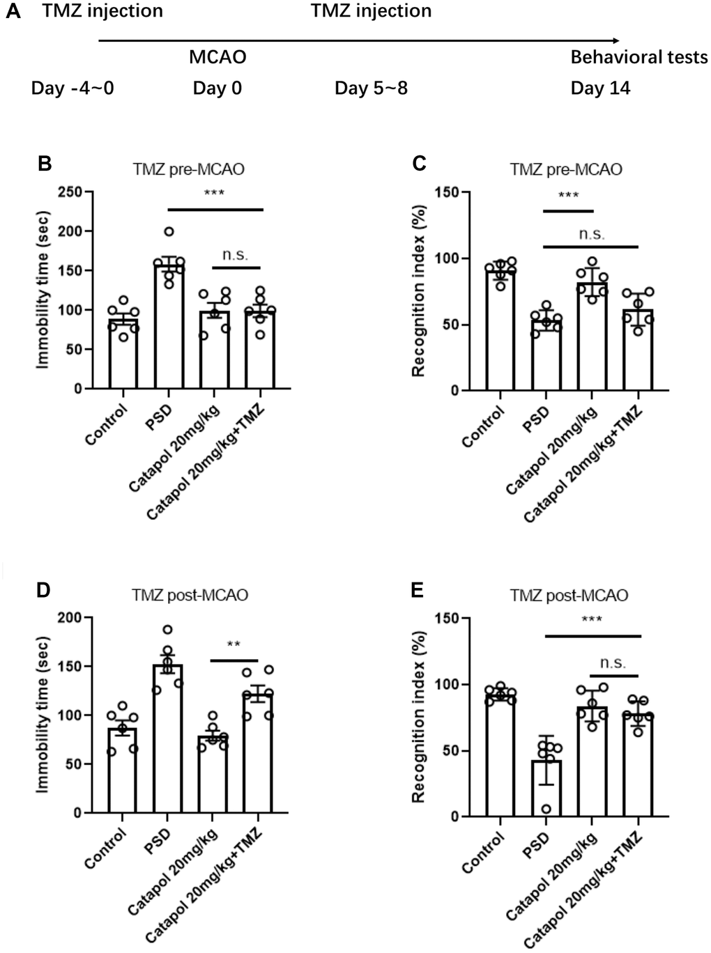 To confirm whether hippocampal neurogenesis serve as the prerequisite to the behavioral effects of catapol, we treated the catapol administrated PSD mice with temozolomide (TMZ), an imidazotetrazine that capable of blocking DNA replication and lead to cytotoxicity in proliferating cells [16]. TMZ were administrated before and after MCAO performance respectively, which aimed to block the newborn immature neurons and newborn mature neurons [17] (Figure 3A). We applied FST and objective recognition tests to evaluate the antidepressant and cognitive functions. TMZ administration before the MCAO and catapol treatment remarkably affected the recognizing time but did not affect the immobility in FST (Figure 3B, 3C; one-way ANOVA, Tukey’s post-hoc test, B: p<0.001 catapol+TMZ vs. PSD; C: no significance, catapol+TMZ vs. PSD). While administrating the TMZ after MCAO resulted in the insignificant cognitive alteration but remarkable decreased immobility in FST. (Figure 3D, 3E; one-way ANOVA, Tukey’s post-hoc test, B: p<0.01 catapol vs. catapol+TMZ; C: no significance, catapol vs. catapol+TMZ). The result indicates long-term process of neurogenesis could be necessary for the effects of the catapol to cognitive behavior, while short-term immature neurons act as the key mechanism underlying the effects of the catapol to antidepressant behaviors. Therefore, persist neurogenesis in hippocampus perform as the key biological underpinning for the effects of catapol to improve the brain functions in PSD model.