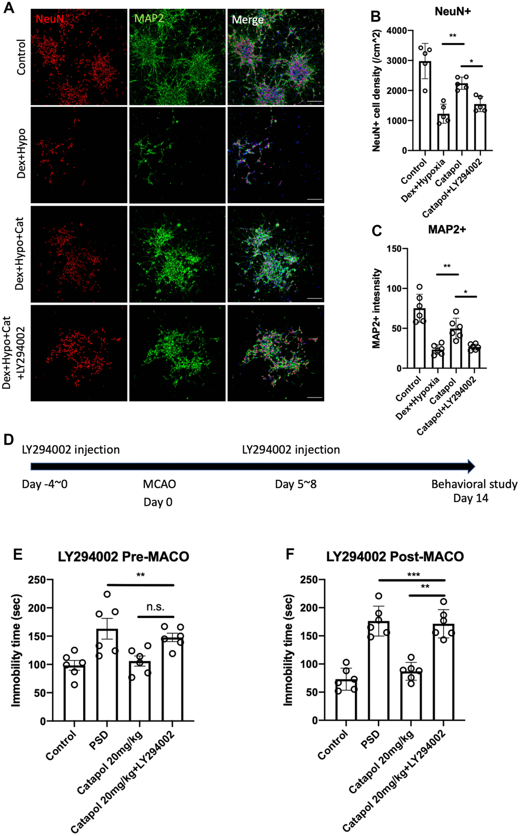 Previous study reported that PI3K signaling plays critical roles in the effects of catapol in preventing apoptosis in hydrogen peroxide-induced endothelium [18]. In this study, we used the human derived neural progenitor cells to induce neurons and treated the catapol under hypoxia in combined with agonist of the glucocorticoid receptor dexamethasone (Dex). We used LY294002 the specific PI3K inhibitor to in the group of catapol treatment (Figure 4A). As the results showed, Dex plus hypoxia dramatically decreased the density of the NeuN and MAP2 signals, indicating the dampened neurogenesis in vitro (Figure 4B, 4C; one-way ANOVA, Tukey’s post-hoc test, p<0.01 vs. control). Catapol treatment recovered the density of NeuN and MAP2 positive neurons (Figure 4B, 4C; one-way ANOVA, Tukey’s post-hoc test, p<0.01 vs. Dex+Hypo). While administration of LY294002 compromised the effects of catapol to increase new neurons (Figure 4B, 4C; one-way ANOVA, Tukey’s post-hoc test, p<0.01 vs. Dex+Hypo+Cat). This result indicates PI3K signaling plays the key roles in the regulating the pro-neurogenic effects of catapol under PSD condition. To further investigate the biological roles of PI3K signaling in catapol regulated behavioral effects, we next treated LY294002 before and after the MCAO (Figure 3). LY294002 treated before the MCAO model did not result in the significant difference of the mobility time (Figure 4D, 4E; one-way ANOVA, Tukey’s post-hoc test). In contrast, LY294002 treated after the MCAO model significantly increased immobility compared with the catapol administration (Figure 4D, 4F; one-way ANOVA, Tukey’s post-hoc test, p<0.01 catapol vs. catapol+LY294002). Taken together, our results suggest that PI3K signaling plays the key role in regulating neurogenesis and the antidepressant behaviors during the newborn immature neurons formation.