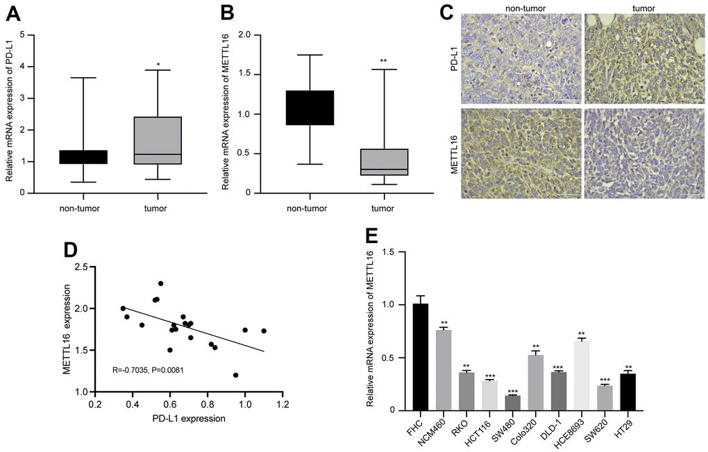 We first analyzed the expression and correlation of METTL16 and PD-L1 in CRC. As shown in Figure 1A, 1B, the RNA level of PDL-1 in collected CRC tumor tissues is notably elevated, whereas the level of METTL16 is significantly decreased, compared with the non-tumor tissues. The IHC analysis of protein expression also indicated elevated PD-L1 and suppressed METTL16 expression in CRC tumor tissues compared with the paired non-tumor tissues (Figure 1C). Results from qPCR indicated a negative correlation between expression of METTL16 and PD-L1 (R=0.7035, p=0.0081). Moreover, we observed significantly decreased level of METTL16 in CRC cell lines, including NCM460, RKO, HCT116, SW480, Colo320, DLD-1, HCE8693, SW620, and HT29, compared with the normal human colon epithelial cell line FHC (Figure 1E). These data indicated that METTL16 may be negatively correlated with PD-L1 expression in CRC.