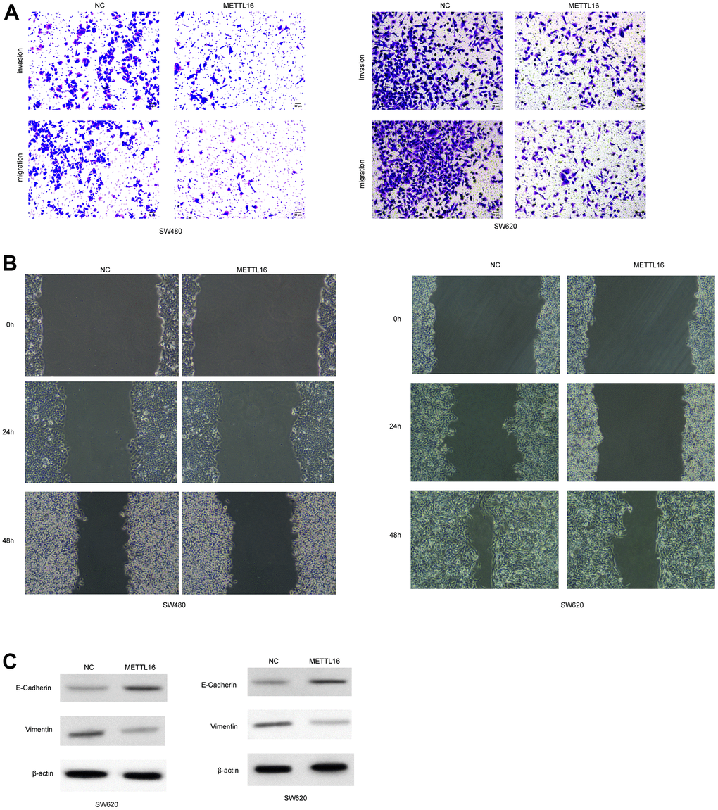 Moreover, among the included CRC cell lines, the SW480 and SW620 exhibited the lowest level of METTL16 and hence were selected for further experiments. We subjected transfection of ectopic expression vectors and siRNAs of METTL16 in these two cell lines and assess cell proliferation, migration, and invasion. The results from western blotting assay demonstrated the successful overexpression and depletion of METTL16 in SW480 and SW620 cells (Figure 2A, 2B). As shown in Figure 2C, 2D, overexpression of METTL16 led to significantly suppressed growth (Figure 2C) and colonies (Figure 2D) of SW480 and SW620 cells. Besides, results from Transwell assay indicated that overexpression of METTL16 notably suppressed the number of migrated and invaded cells (Figure 3A). The suppressed healing of wounds in Figure 3B also suggested the impeded cell migration. Results from western blotting showed that overexpression of METTL16 caused increased level of E-cadherin and decreased level of Vimentin in SW480 and SW620 cells (Figure 3C), indicating the enhanced EMT. These data indicated that METTL16 suppressed CRC cell proliferation, migration and invasion.