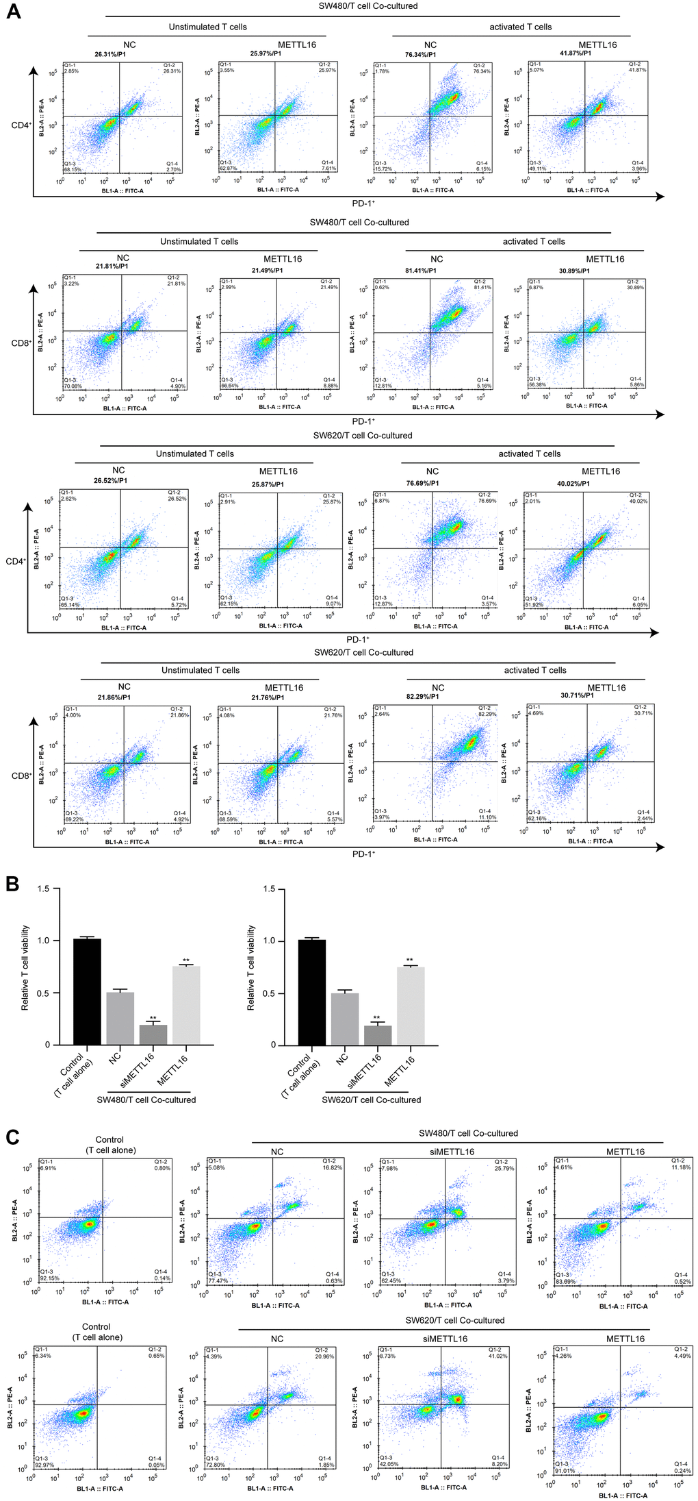 To explore the effects of METTL16 on immune invasion of CRC cells, we adopted a co-culture system of CRC cells with unstimulated or activated T cells and evaluated the activation, viability and apoptosis of T cells. As shown in Figure 1A, the portions of PD-1+ cell in activated T cells were notably decreased under co-culture with METTL16-overexpressed CRC cells, compared with those co-cultured with control CRC cells. Moreover, co-culture with CRC cells notably suppressed the viability and induced apoptosis of T cells (Figure 4B, 4C), which were significantly enhanced by depletion of METTL16 in CRC cells. Besides, overexpression of METTL16 reversed the suppressive effects of CRC cells on T cell viability (Figure 4B, 4C). These data suggested that METTL16 overexpression in CRC cells could promote immune response of T cells.