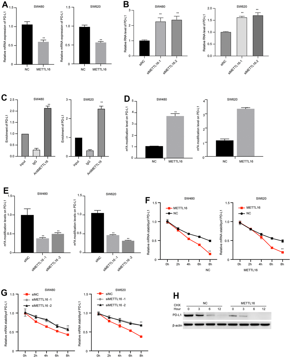 To conclude, we identified the suppressed METTL16 expression in CRC tumors and demonstrated that METTL16 overexpression suppressed CRC cell proliferation, migration and invasion. Mechanistically, METTL16 induced the m6A modification of PD-L1 to inhibit immune evasion and enhance the therapeutic effects of anti-PD-1 treatment on CRC.