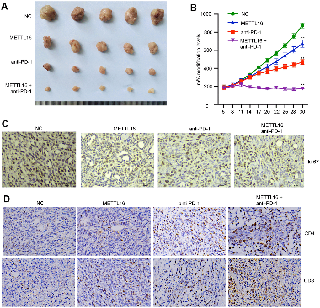 We next investigated the in vivo effects of METTL16 on CRC development. A xenograft tumor model was established using SW480 cells and treated with anti-PD-1 antibody. We observed that overexpression of METTL16 suppressed the tumor size and tumor growth curve and enhanced the tumor suppressive effect of anti-PD-1 antibody (Figure 6A, 6B). Analysis on tumor tissues demonstrated that overexpression of METTL16 and blocking of PD-1 could notably suppress the expression of proliferative biomarker Ki-67 (Figure 6C). Moreover, the levels of CD4 and CD8 positive cells in tumor tissues were notably elevated by overexpression of METTL16 and anti-PD-1 treatment compared with the control group and were further increased by their combination (Figure 6D).