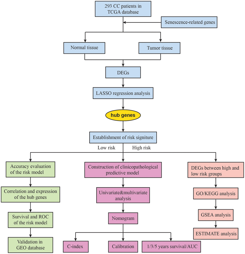 The development of biotechnology has made new methods such as bioinformatics analysis widely available. This has resulted in important contributions to tumor diagnosis and prognosis prediction by identifying candidate biomarkers and exploring the molecular mechanisms of cancer. RNA sequencing can be used to identify splice variants, unmapped genes, and spliced unidentified noncoding RNAs. Using the dataset of The Cancer Genome Atlas (TCGA) for CC, a risk prediction model was built based on 3 autophagy-related genes (CHMP4C, FOXO1, and RRAGB), and can be used to effectively predict the prognosis of CC patients [9]. New biomarkers for prognosis prediction of CC are required to develop advanced therapy strategies and further improve therapeutic treatments. In this research, we gathered the expression profiles and clinical data of patients diagnosed with CC. From the aging database, we identified several senescence-related genes (SRGs) and selected differentially expressed genes (DEGs) associated with senescence for further analysis. Using LASSO regression, we developed a prognostic multigene signature based on these DEGs in the TCGA cohort. We then validated the signature in an independent GEO cohort. Additionally, we constructed a predictive nomogram to assist in predicting the prognosis of CC patients, which was further validated using data from the TCGA cohort.