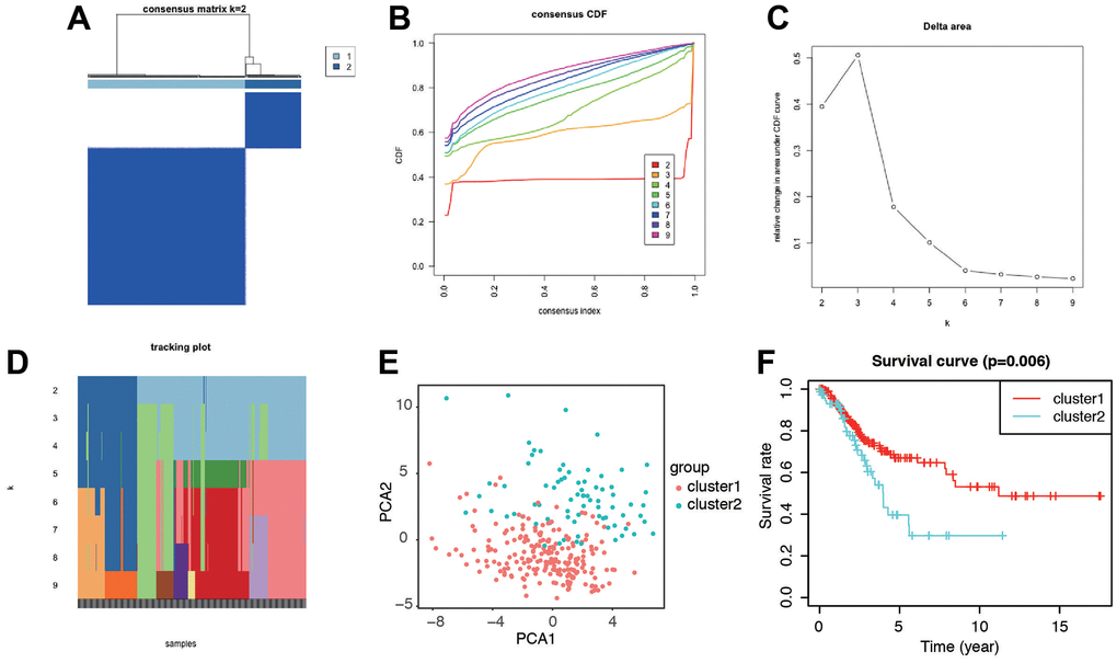 To gain further insights into the characteristics of senescence-related genes in cervical cancer, we employed a consensus clustering algorithm to classify patients based on the expression profiles of 279 senescence-related genes. Through this analysis, we identified two distinct clusters, with k=2 being the optimal choice (Figure 3A–3D). PCA analysis revealed clear separations in the distribution of senescence-related genes between the two clusters (Figure 3E). Importantly, patients in cluster 1 exhibited a significantly longer OS compared to those in cluster 2, as demonstrated by Kaplan–Meier analysis (log-rank test, P = 0.006; Figure 3F). These findings motivated us to delve deeper into the association between senescence and prognosis in CC patients by investigating the expression patterns of senescence-associated genes.