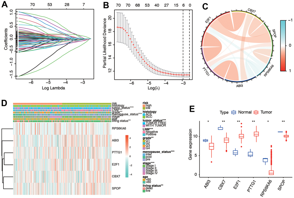 We merged the expression profiles of SRGs and clinical follow-up information of CC to identify a total of CC samples. Through LASSO regression analyses, we identified 6 genes that exhibited significant associations with prognosis, including RPS6KA6, ABI3, PTTG1, E2F1, CBX7, and SPOP (Figure 4A, 4B). Table 1 shows the coefficients of each gene a. Using the prognostic model comprising these six DE-SRGs, we calculated the risk score for each patient, which consisted of 1 potential risky gene and 5 potential protective genes. According to the results of coefficient of each gene, we constructed the prognostic model as follows: risk score= -(PTTG1*0.009676657) –(E2F1*0.025364333) –(CBX7*0.054322881) –(SPOP*0.175131225) +(RPS6KA6*0.09447039)- (ABI3*0.070493701). Patients were then divided into low-risk (n=153) and high-risk groups (n=153) based on the median risk score. We further investigated the relationship among the 6 genes. The results indicated that they were significantly relevant (Figure 4C). Moreover, the heatmap (Figure 4D) depicted the expression levels of the six genes in both low- and high-risk patients within the TCGA dataset. Notably, we observed substantial differences between the high- and low-risk groups in relation to various clinical factors, including tumor status, lymph node metastasis (LNM), grade, menopause status, stage, age, and living status. We deeply analyzed the expression of the six genes in different kinds of samples. We found they were significantly different expressed in cervical tissues (Figure 4E). These results indicated the six senescence-related genes were significantly different in high and low risk groups.