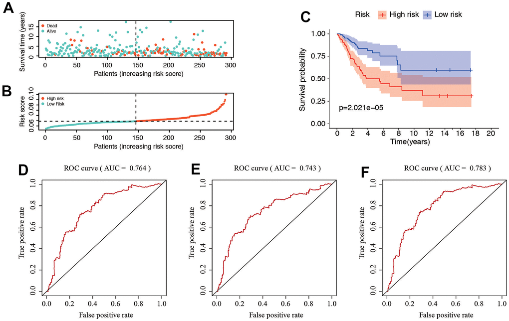 The distribution of risk score and survival status of these 6 prognostic DE-SRGs are shown in Figure 5A, 5B. Patients in high-risk group were vulnerable to have a higher risk score and worse prognosis. The survival analysis using the Kaplan–Meier curve revealed a significantly worse prognosis for patients in the high-risk group (P=2.021e-05, Figure 5C). The time-dependent ROC analysis (Figure 5D–5F) displayed the predictive performance of the model, with AUC values of 0.764, 0.743, and 0.78 for predicting the 1-year, 3-year, and 5-year survival rates, respectively. These results suggested that the SRG-related risk model is accurate and high predictive for patients with CC.