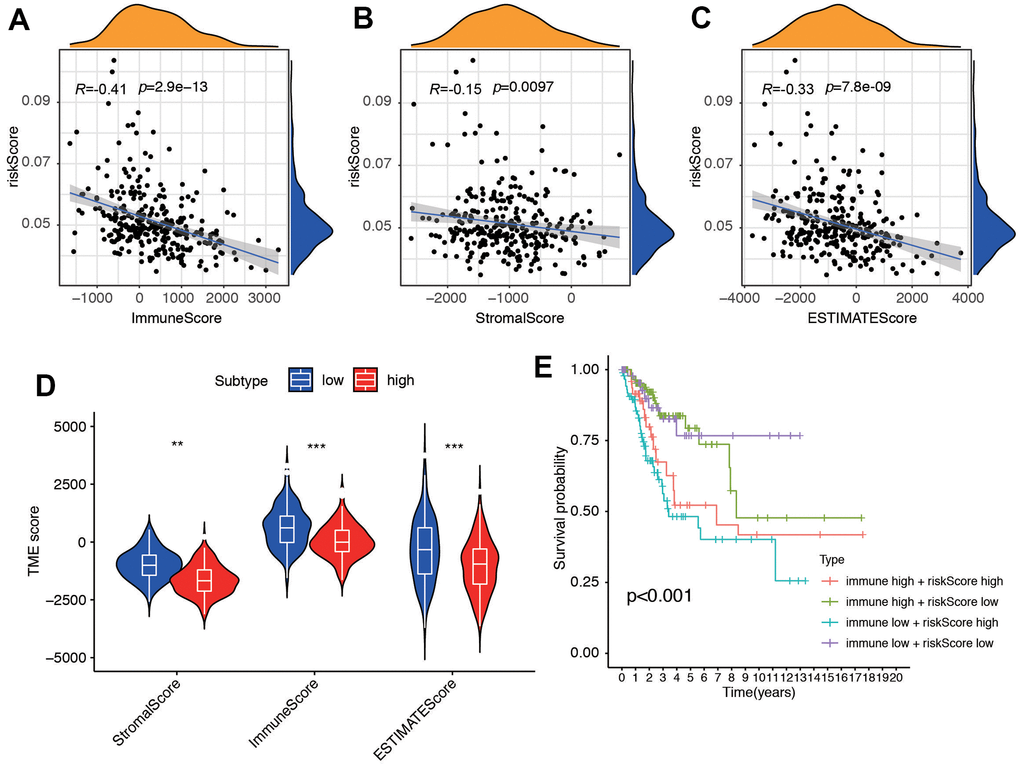 We performed additional analysis to investigate the correlation between the risk score and ESTIMATE-related scores, encompassing immune score, stromal score, and ESTIMATE score. Our findings revealed a negative correlation between these scores and the risk score, with correlation coefficients of -0.41, -0.15, and -0.33, respectively (all P < 0.01, Figure 6A–6C), which pointed out that stromal and immune cell was lower in the high risk group. The results suggested that patients in the high-risk group had an unfavorable prognosis, which was associated with alterations in the tumor immune microenvironment of CC. We then compared the tumor microenvironment (TME) score between low and high risk groups (Figure 6D). Additionally, we categorized the patients into four subgroups based on their immune score and risk score, with high and low scores determined by the median value of the risk score. Conversely, patients with a low immune score and high risk score had the poorest prognosis (Figure 6E).