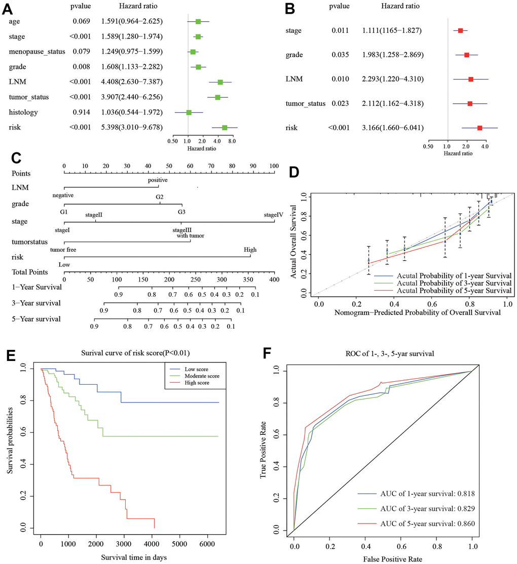 To develop a clinical strategy for predicting the survival probability of CC patients, we created a nomogram using the TCGA cohort. This nomogram was used to assess the probability of different period of OS. We first performed the univariate and multivariate analyses to recognize independent risk factors for CC patients. The results of univariate analysis showed that stage (HR=1.589, 95%CI: 1.280-1.974, P<0.001), grade (HR=1.608, 95%CI: 1.133-2.282, P=0.008), LNM (HR=4.408, 95%CI: 2.630-7.387, P<0.001), tumor status (HR=3.907, 95%CI: 2.440-6.256, P<0.001), and 6-gene risk signature (HR=5.398, 95%CI: 3.010-9.678, P<0.001) are significantly associated with survival of CC (Figure 7A). Furthermore, we enrolled these factors into a multivariate Cox analysis. Finally, we found that stage (HR=1.111, 95%CI: 1.165-1.827, P=0.011), grade (HR=1.983, 95%CI: 1.258-2.869, P=0.035), LNM (HR=2.293, 95%CI: 1.220-4.310, P=0.010), tumor status (HR=2.112, 95%CI: 1.162-4.318, P=0.023), and 6-gene risk signature (HR=3.166, 95%CI: 1.660-6.041, P<0.001) were independent risk factors for CC patients (Figure 7B). These five independent prognostic factors were used to construct the nomogram (Figure 7C). The diagonal line at 45° represented the ideal prediction. The calibration plots demonstrated that the nomogram exhibited excellent performance in predicting the 1-year, 3-year, and 5-year survival outcomes (Figure 7D). The specific scores for each factor were provided in Table 2. The C-index of the model was 0.78 (95% CI: 0.69-0.86). Moreover, we divided the cohort evenly into three subgroups (low-score, moderate-score, and high-score groups) based on their risk scores from the nomogram. Subsequently, we evaluated the differences in Kaplan-Meier survival among these three groups, including the low-, moderate-, and high-risk groups. The survival curve of the high-score group demonstrated worse overall survival (OS) compared to the moderate and low-score groups (Figure 7E). ROC curve analysis in Figure 7F exhibited that the risk score AUC value of 1-, 3-, 5-year survival was 0.818, 0.829, and 0.860. These findings suggested that the nomogram had a high accuracy in predicting OS.