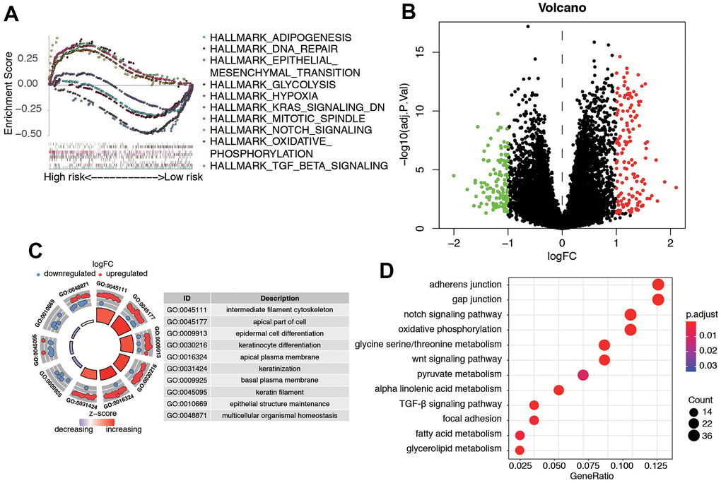 Furthermore, we utilized Gene Set Enrichment Analysis (GSEA) software to identify the enriched pathways or functions in the high-risk and low-risk patient groups. The top ten terms enriched in these groups are depicted in Figure 8A. The results showed that key important pathways, such as the adipogenesis, DNA repair, EMT, KRAS signaling, and Notch signaling were significantly activated in the risk group. Then, we performed a differential expression analysis between low-risk group and high-risk group using Wilcoxon test with a log2(Fold Change) > 1 and P < 0.05. We found 271 DEGs between the two groups, including 154 up-regulated genes and 117 down-regulated genes (Figure 8B). Supplementary Table 3 contains the DEGs list along with their corresponding log2FC and FDR adjusted P-values. Subsequently, we conducted GO and KEGG pathway analysis for these DEGs, and Figure 8C, 8D displays the top 10 enriched terms in the GO and KEGG pathways, respectively. The KEGG analysis indicated that the genes were mainly involved in gap junction, notch signaling pathway, oxidative phosphorylation, glycine serine/threonine metabolism, and WNT signaling pathway.