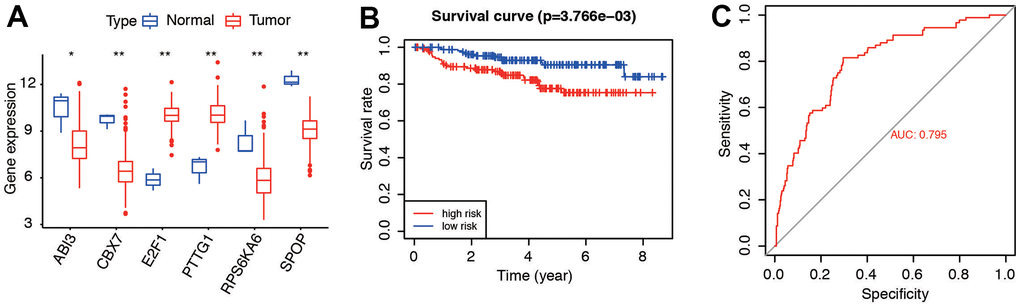 GSE44001 and GSE52903 were acquired to validate. We compared the content of the six genes (Figure 9A), survival curve of risk model (Figure 9B, P=3.766e-03), and predictive accuracy by AUC (Figure 9C, AUC=0.795) in the dataset. Results in GSE52903 indicated the similar expression and prognosis (Supplementary Figure 1). Consistent with the results in the entire TCGA cohort, these results suggested that six genes were highly predictive for evaluating the prognosis of CC patients.