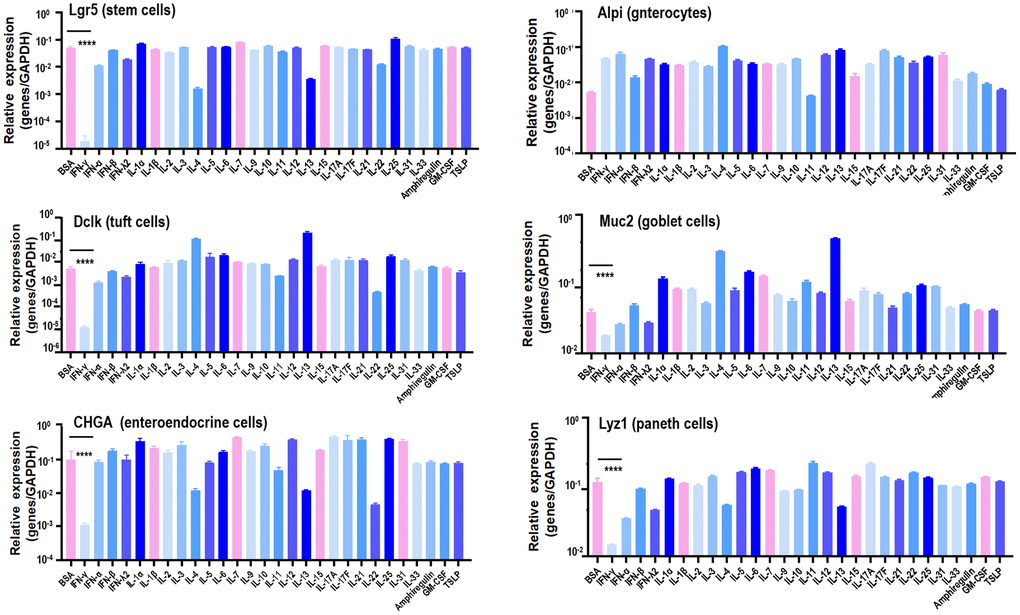 Paneth cells, together with Tuft cells (epithelial chemosensory cells that can detect and relay information from diverse luminal substances via immune cells [17]), Goblet cells (specialized epithelial cells secreting pro-inflammatory cytokines [18]), enteroendocrine cells (chemo-sensors in the intestinal epithelium [19]), and enterocytes (the most abundant epithelial cell lineage in SI and LI that produces cytokines coordinating responses from subepithelial immune populations [20]), represent the principal types of cells in the SI epithelium [21]. To identify the specific cytokine that suppresses SI spheroids, the effects of a diversified spectrum of cytokines (IL-1α, IL-1β, IL-2, IL-3, IL-4, IL-5, IL-6, IL-7, IL-9, IL-10, IL-11, IL-12, IL-13, IL-15, IL17A, IL17F, IL21, IL22, IL25, IL31, IL33, IFNα, IFNβ, IFNγ, IFNλ2), thymic stromal lymphopoietin (TSLP) and other inflammation-associated factors such as amphiregulin (AREG, a ligand of EGFR) and granulocyte-macrophage colony stimulating factor (GM-CSF) on these primary SI epithelium cells were examined using the whole colorectal organoid. Stem cells (Lgr5+), Tuft cells (Dclk1+), Goblet cells (Muc2+), enteroendocrine cells (GHGA+), and Paneth cells (Lyz1+) expressed sufficiently lower levels of IFNγ than other cytokines examined, suggestive of the critical role of IFNγ in maintaining enteric homeostasis under physiological conditions as well as its suppressive functionalities on colorectal spheroid formation (Figure 1, Supplementary Figure 2).